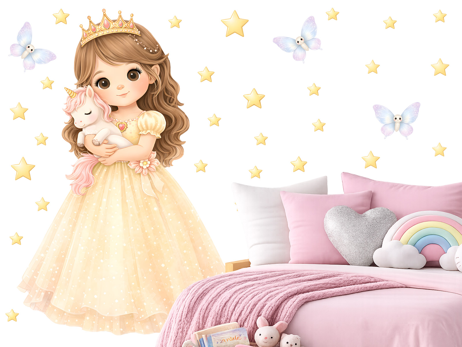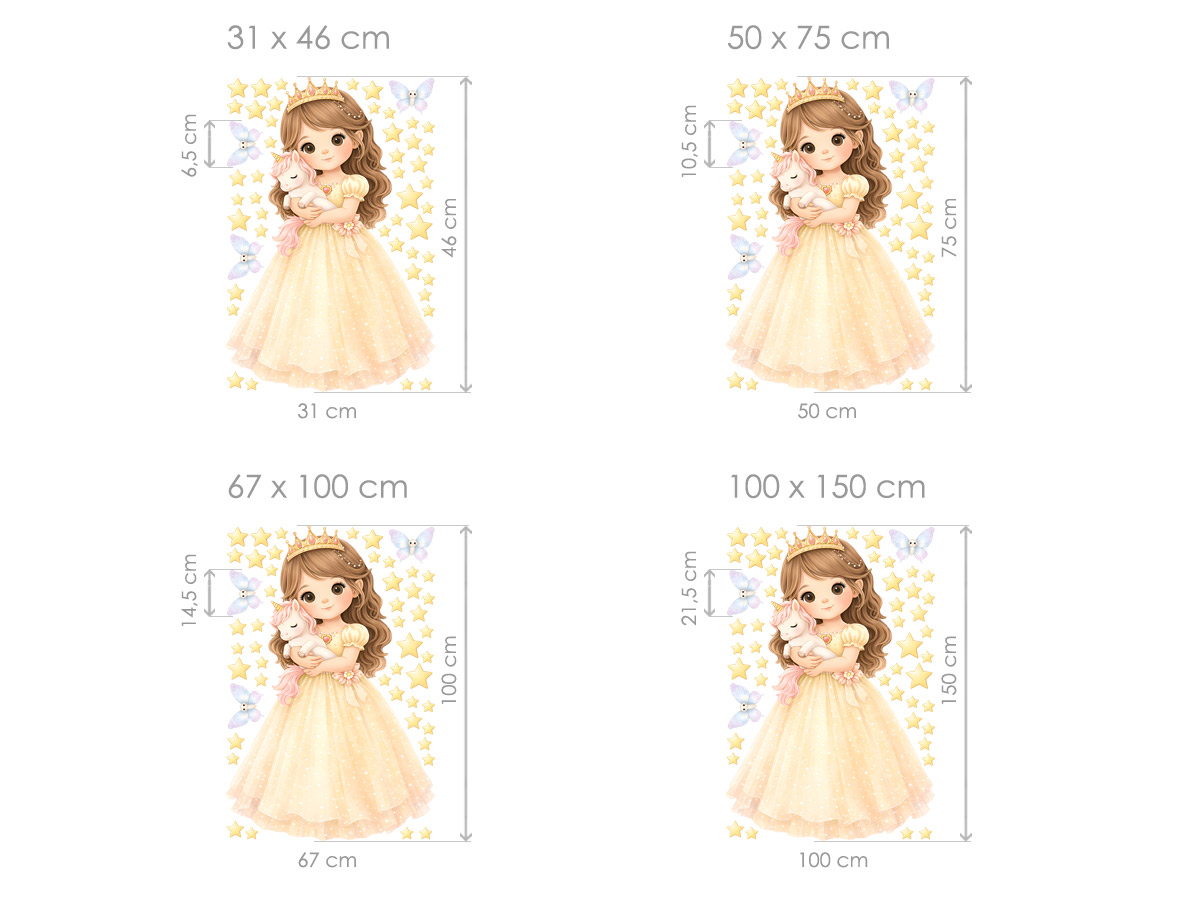 Samolepky na stenu „Princezná a jednorožec“ prenesú detský izba do kúzelného pohádkového sveta plného fantázie, snov a jemné mágia. Roztomilá princezná v nadýchaných šatoch, ktorá s láskou objímá malého jednorožca, vytvára&´ nežnú a ukľudňující atmosféru, ideální pre dievčatkoí izba, herňu alebo čítačí kútik. Ilustrácia je ladená. do jemných pastelových tónov, doplnená hviezdičkami a drobnými motýlkami, ktoré priestor krásne oživí bez toho, aby pôsobili rušivo. Samolepky pôsobí ľahko, pohákovo a veºmi harmonicky, takže sa ľahko kombinuí s ostatní výzdobou izby a podporují detskú predstavivosť aj pocit bezpečí. Tento motív sa stane prirodzeným stredom pozornosti a vytvorí útulné místo, kde sa bude každé díte cítit ako v pohádke.