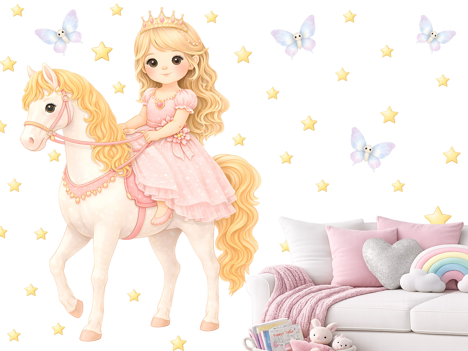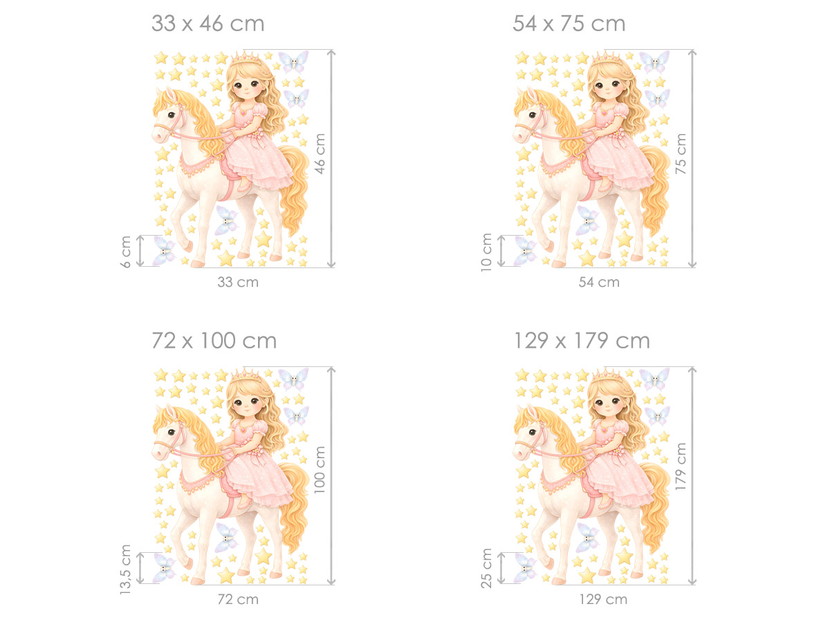 Samolepky na stenu Princezná na koni prenesú detský izba do sveta pohádek, fantázie a jemné elegancia. Kúzelneá ilustrácie princeznej idúí na krásném koni, doplnenýá hviezdičkami a drobnými motýlkami, pôsobí ľahko, snovo a veľmi nežne. Pastelové farby a priátelský výraz postavičiek vytvárají harmonickú atmosféru, ktorá je ideální pre dievčatkoí izba, herní kútik alebo priestor u postýlky. Samolepky je mo|né jednoducho rozmísti† poda vlastneí predstavy, krásne vyniknú ako hlavní motív na stene a podporují detskú fantáziu, pohádkové príbehy aj pocit bezpečí a radosti. Tento motív sa skvele hodí pre všetky malé milovníčka princezien, koní a kúzelných svetov.