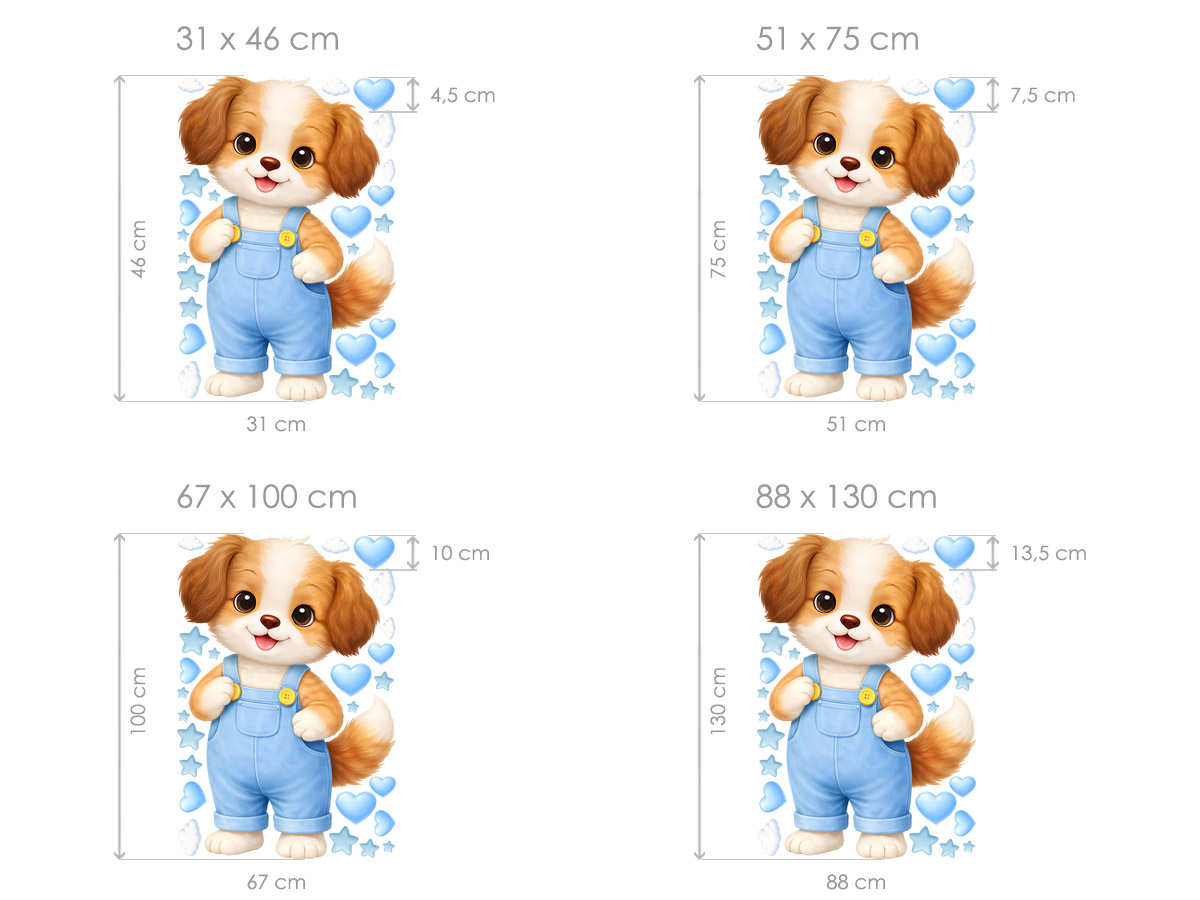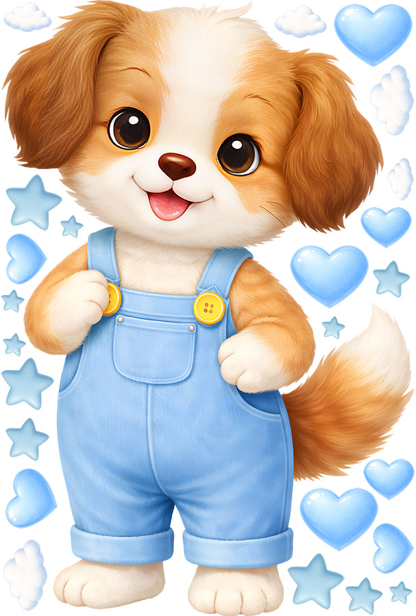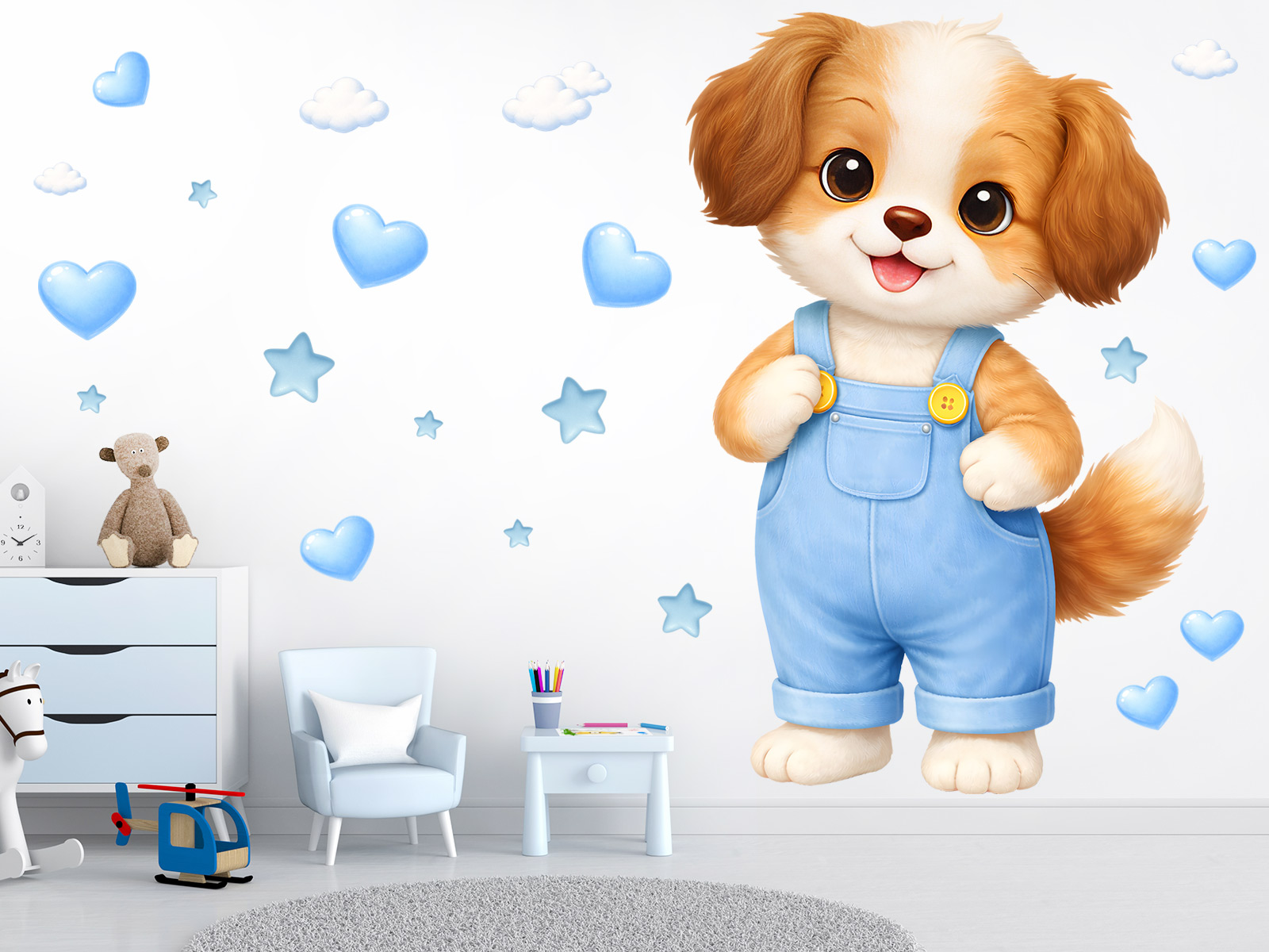 Samolepka na stenu „Psík v nohaviciach“ vnesie do detskej izby radosť, hravosť a jemnú pohádkovú atmosféru. Roztomilý psík s veľkýma očami a veselým výrazom, oblečený do svetlo modrých nohavíc, pôsobí prátelsky a milo na prví pohľad a okamžite si získá detskú pozornosť. Motív dopĺňají drobné dekoratívneí prvky v podobe sŕdcíčiek, hviezdičiek a obláčkov, ktoré vytárejí ľahký, vzdušný dojem a podporují fantáziu aj pocit bezpečí. Farebnos¤ je jemná a harmonická, vhodná do izbíčku pre bábätká aj vetší deti, kde motív prirodzene navodí pokojnú a veselú atmosféru. Súčástí produktu je arch so samolepkou a náhladová vizualizácia, ktorá ukazuje, ako prívetivo a hravo motív pôsobí v reálném interiéri.