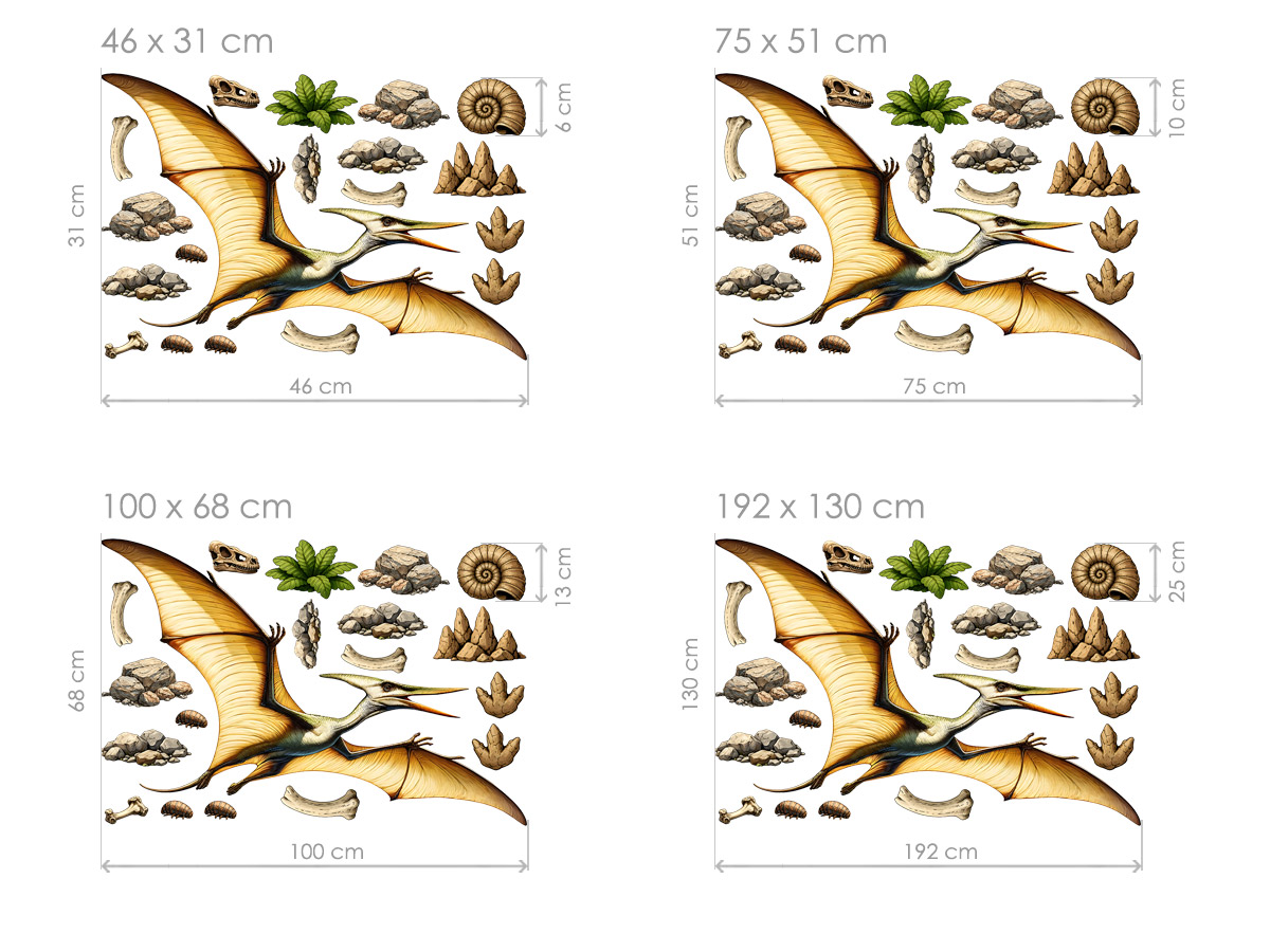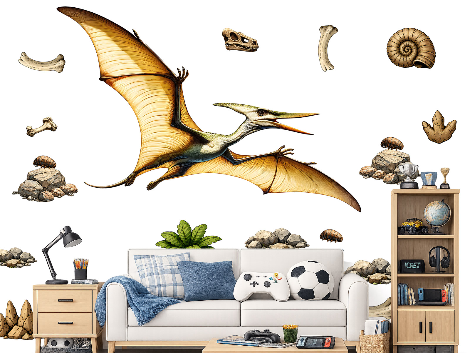 Samolepka na stenu Pterodaktyl prináša do detskej izby dobrodružnú atmosféru praveku plnú objavovania a fantázie. Dominantný lietajúci pterodaktyl s roztiahnutými krídlami pôsobí dynamicky a realisticky, takže okamžite upúta pozornosť každého malého nadšenca do dinosaurov. Celý motív dopĺňajú fosílie, kamene a odtlačky, ktoré vytvárajú zaujímavú scénu inšpirovanú svetom dávnych čias. Prírodné odtiene hnedej, béžovej a tlmenej zelenej dodávajú dekorácii autentický vzhľad a skvele zapadnú do moderného detského interiéru. Jednotlivé prvky je možné rozmiestniť podľa vlastného priestoru, takže si ľahko vytvoríte originálnu kompozíciu na mieru – nad posteľ, pracovný kútik alebo na celú stenu. Ideálna dekorácia pre deti, ktoré milujú dinosaurami, dobrodružstvo a objavovanie sveta praveku.