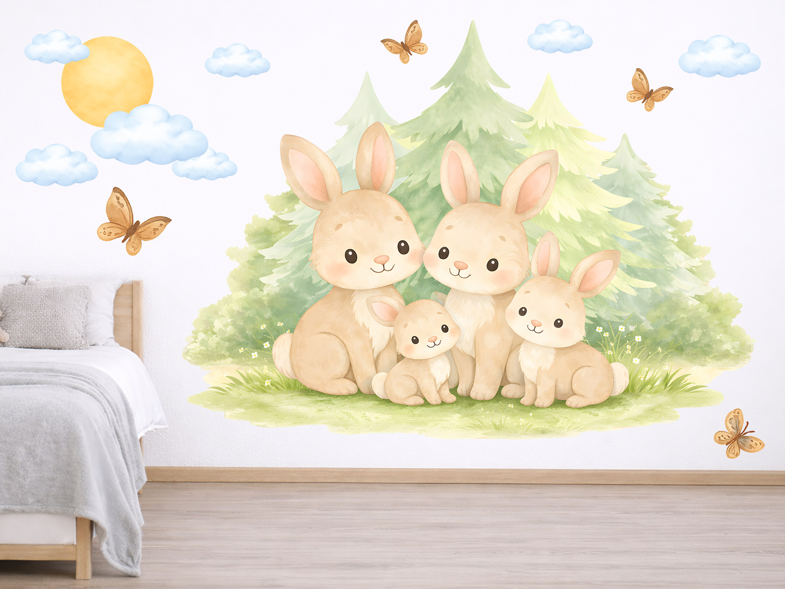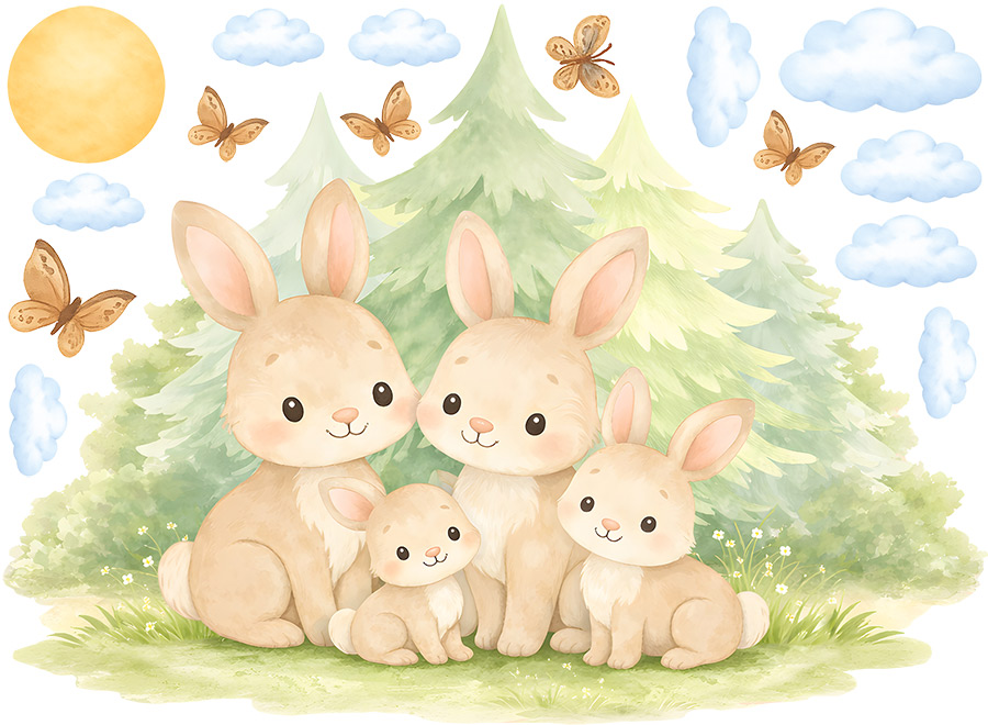Samolepka na stenu Rodina zajíčkov vnesie do detského izby pocit nehy, bezpečí a kľudneé rodinné pohody. Roztomilá skupinka zajaíčkov schúlených pred jemnými lesními stromami pôsobí láskyplne a harmonicky a vytvára&´ útulnú scénu plnú tepla a blízkosti. Akvarelový štýl ilustrácie s mäkkími pastelovými farbami, obláčkami, motýlkami a slníkom podporuje detskú fantáziu a navodzuje pokojnú, snovú atmosféru ideální pre odpočinok aj hraní. Motív je vhodný do izbíčku pre bábätká aj vetší deti a krásne zapadne do prírodne, škandinávsky aj jemne pastelovo ladených interiérov. Zákazník obdrí hárok s hlavním motívom rodiny zajíčkov doplnený o samostatné dekoratívneí prvky, diíky ktor&m#3;ou je možné vytvoriť harmonickú kompozíciu poda vlastneí predstavy. Celý dizajn pôsobí nežne, nadčasovo a hrejivo a stane sa krásnou dominantou detskej izby.