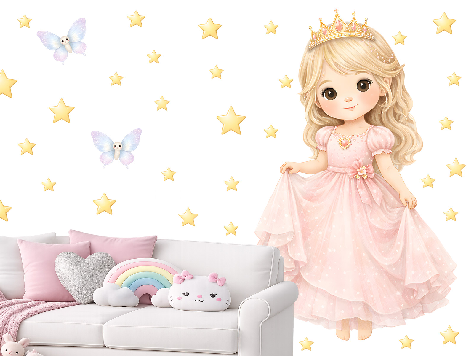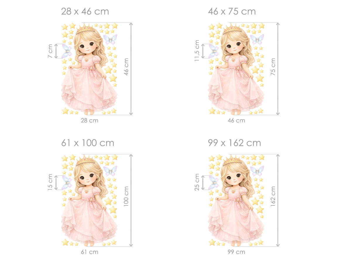 Samolepky na stenu Pohádková princezná premení detský izba v jemnejý pohádkový svet plný kúziel, snov a fantázie. Roztomilá princezná v ružových šatoch s korunkou pôsobí nežne, pokojne a priateľsky, takže sa skvele hodí do dievčenskej izby, herničky i kútika na čítanie; alebo odpočinok. Ilustrácia je ladená. do pastelových tónov a doplnená hviezdičkami a drobnými motýlkami, ktoré vytárejí ľahkú a vzdušnú atmosféru bez rušivých prvkov. Samolepka krásne vynikne nad postýlkou, vedľa postele aj na ve&´ prázdné stene a ľahko sa kombinuje s dalšími pohádkovými dekoráciami. Pohádková princezná podporuje detskú predstavivosť, navodzuje pocit bezpečí a radosti a pomáhá vytvoriť harmonické prostredí, v ktorém sa deti cítí dobre každý deň.