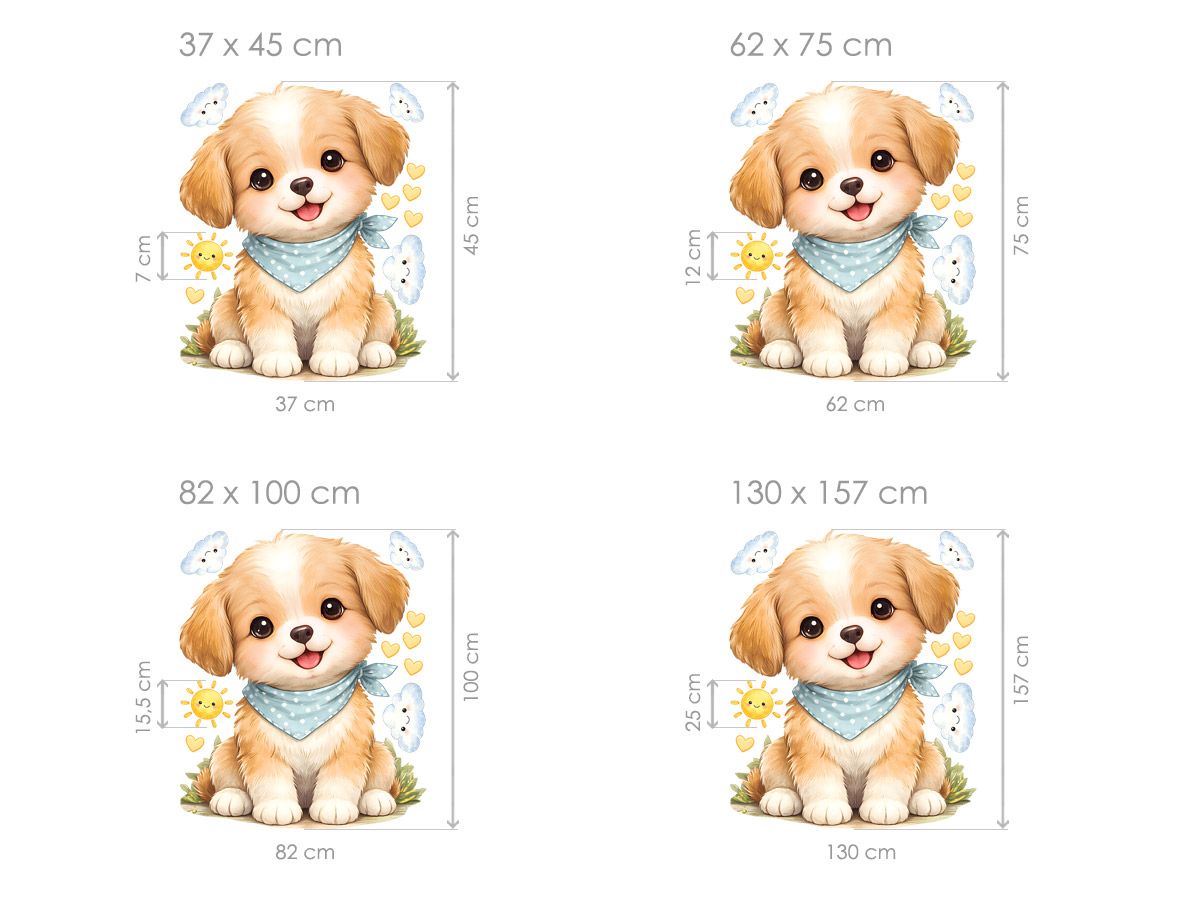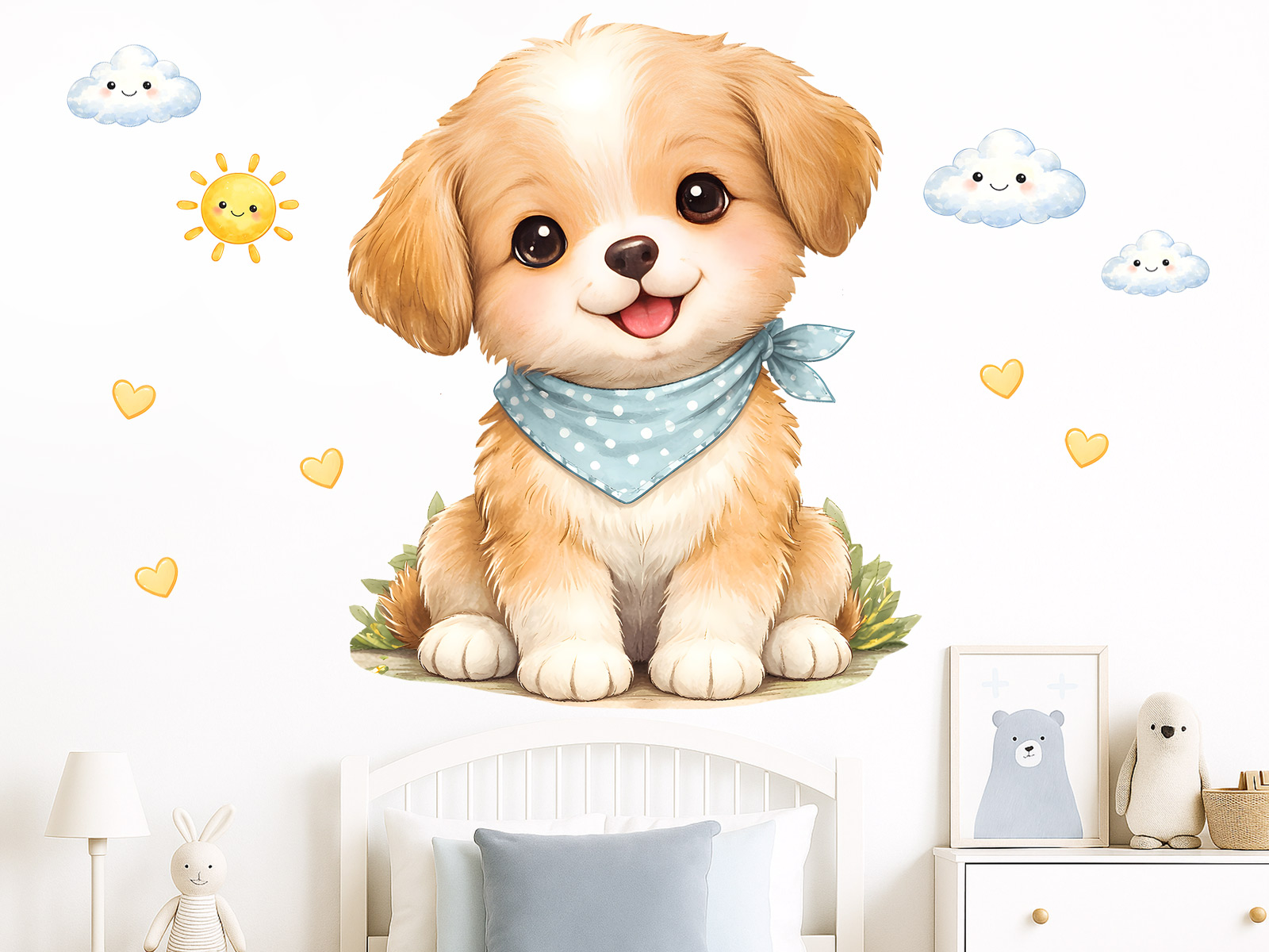 Samolepky na stenu s roztomilým štenátkom vnesú do detskej izby hrejivú a radostnú atmosféru plnú nehy. Jemná ilustrácie psíka s velkýma očami, doplnenýá o obláčky, srdíčka a slíčko, pôsobí milo a priateľsky, takže sa skvele hodí do izbíčky bábätiek aj menších detí. Teplé farby a mäkké línie podporují pocit pokoja, bezpečí a pohody, čo je ideální pre priestor určenýý k odpočinku aj hraní. Samolepky sa ľahko aplikují na stenu a diaíky možnosti volného rozmístení drobných detailov umožní vytvoriť osobitú dekoráciu, ktorá premení prázdnu stenu v útulné místo plné radosti a detské fantázie.