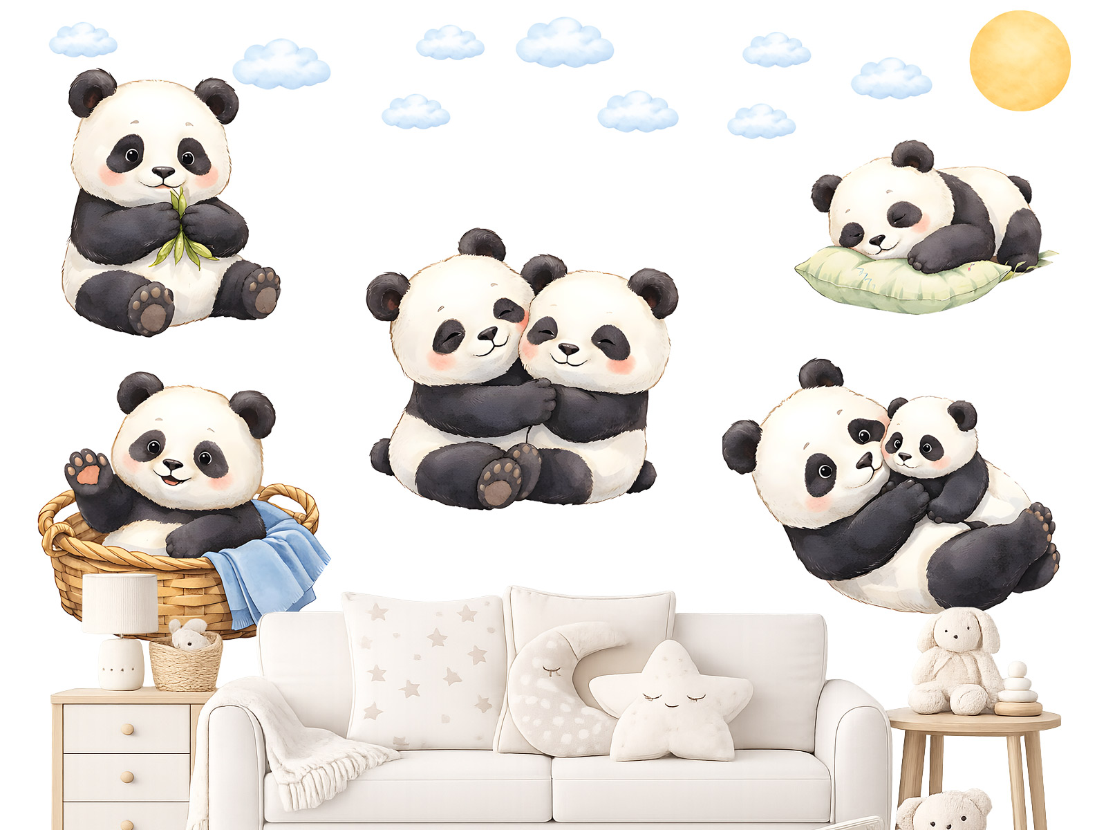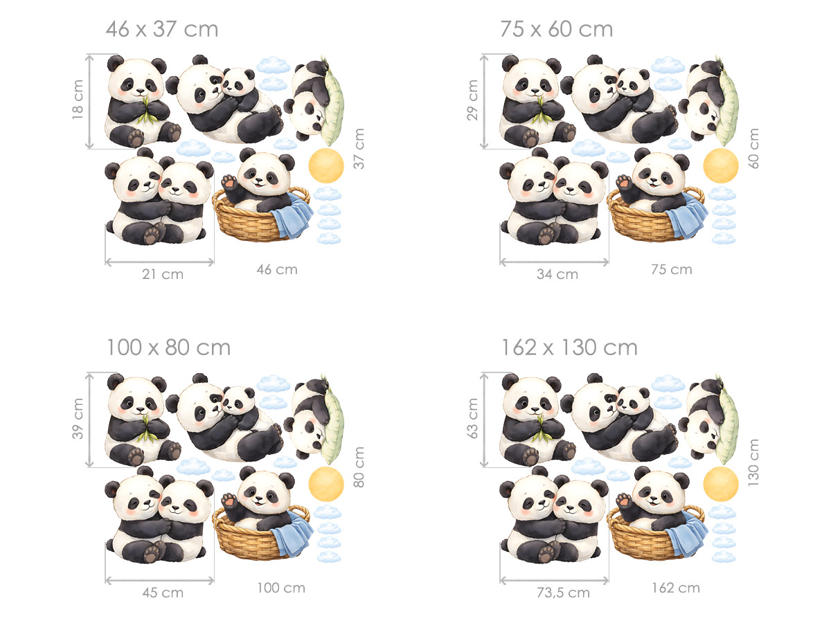 Samolepka na stenu Roztomilé pandy prináša do detskej izby nežnú a upokojujúcu atmosféru plnú lásky a pohody. Jemné akvarelové ilustrácie pánd pôsobia veľmi priateľsky a sú ideálne na vytvorenie pokojného prostredia pre odpočinok aj hranie. Pandy sú zobrazené v rôznych roztomilých situáciách – pri objímaní, odpočinku aj hraní, čo dodáva celej dekorácii živosť a príbeh. Ich hebký vzhľad a jemné pastelové odtiene krásne ladia s moderným detským interiérom. Motív dopĺňajú drobné obláčiky a slniečko, ktoré celej kompozícii dodávajú ľahkosť a harmóniu. Jednotlivé prvky je možné rozmiestniť podľa vlastného priestoru a vytvoriť si tak originálne usporiadanie na mieru. Ideálna dekorácia pre všetky deti, ktoré milujú zvieratká a jemný, hrejivý dizajn plný nehy.