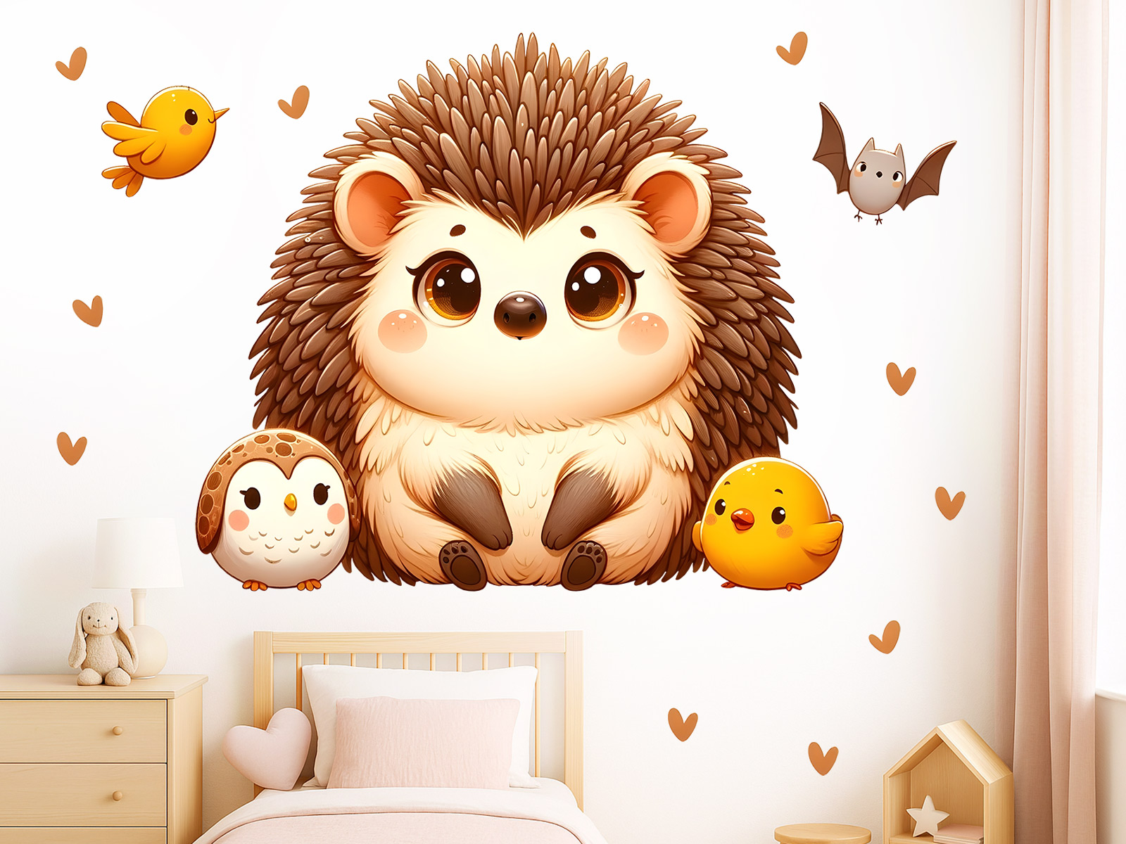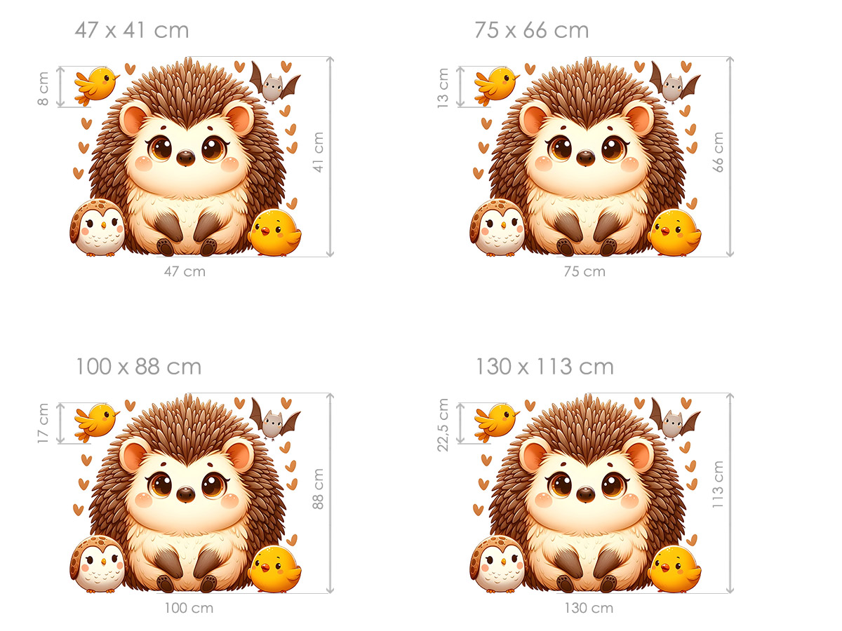 Samolepka na stenu „Roztomilý ježko“ priáší do detského izby jemnú, hrejivú atmosféru plnú nehy a radosti. Hlavní postavičkou je usmievavý, nadýchaný ježko s veľkími zárícími očami, ktorý pôsobí priátelsky a okamžite zaujme každé díťa. Je obklopený malími lesními kamarády – veselým vtákom, roztomilou sovičkou a žlt&ym kuřátkom – a celú scénu dopĺňají jemná srdíčka v teplých odstínoch, ktorá dodávají ilustráciu je víke pohádkového kúzla. Celok pôsobí harmonicky, hravo a pritom veľmi upokojujícím dojmom, diíky čomu sa skvele hodí ako dekorácia nad postýlku, komodu alebo do hracího kútika. Táto samolepka vytvorí v izbe útulné místo, ktoré bude deti prirodzene priťahovať a podporovať ich fantáziu.