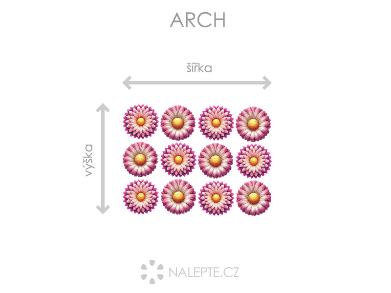 Arch = takto vám bude samolepka doručená. Každý prvok na archu je samostatná samolepka, jednotlivé části jednoduše od papírového podkladu odlepíte a nalepíte na stenu tak, aby zložili výposlední motív podľa Vašich predstáv. Arch si môžte prehliada'a vo fotogalérii. Rozmer archu volíte v objednáke. Prehľad preddefinovaních rozmerov (šírka x výška): - 12 ks 4 x 4 cm - 12 ks 6 x 6 cm - 12 ks 10 x 10 cm - 12 ks 18 x 18 cm - 12 ks 24 x 24 cm Je možné zvoliť aj ľubovoľneý vlastní rozmer hárku pomocí posuvníku alebo klikání na "Vetší", "Menší"