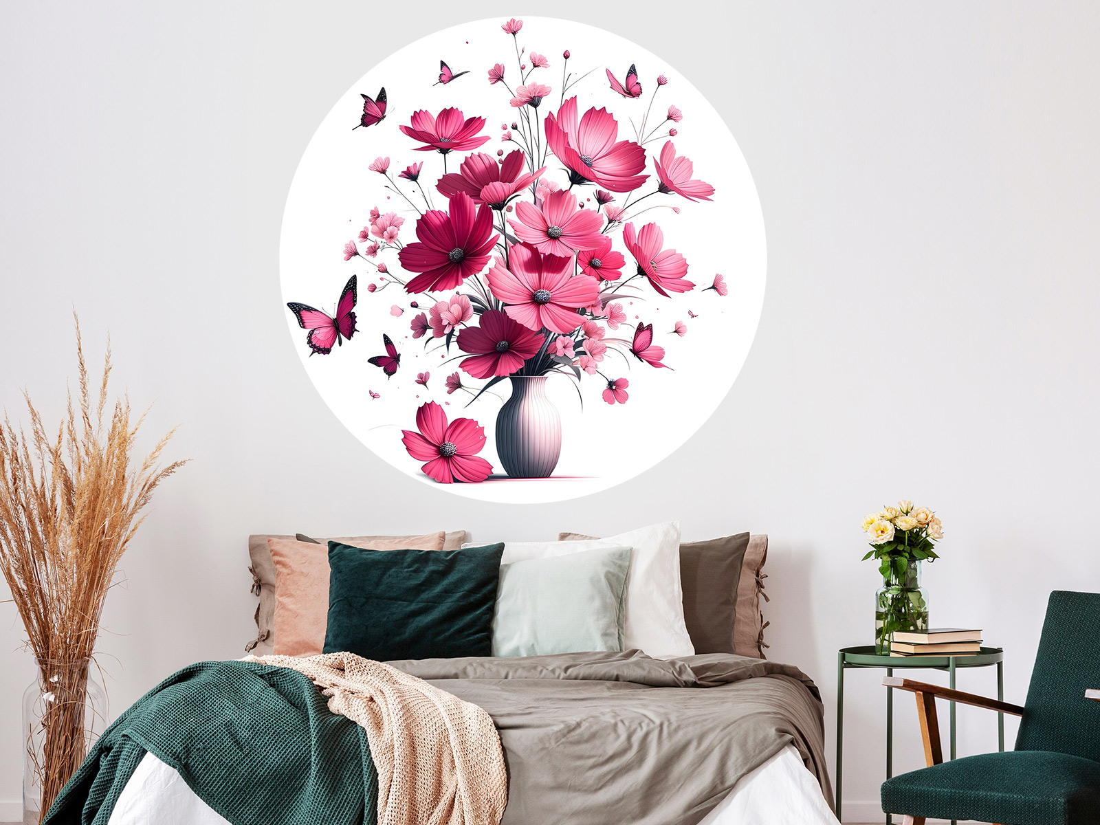 Samolepka „Ružové kvety vo váze“ priáší do interiéru jemnos¤, eleganciu a pozitívneí energiu, ktorá zútulní každý domov. Dominantou motívu je bohatá; kytica ružových kvetov rozkvétajících do všoch strán, doplnenýá ľahkími okvetními lístkami a elegantne poletujícími motýlami, ktoré scéne dodávají vzdušnosť a romantický nádych. Tóny ružové pôsobí hrejivo a harmonicky, diíky čomu sa dizajn hodí nie len do spální alebo obívacích izieb, ale aj do moderních interiérov alebo dámských priestorov, kde vytvorí jemný dekoratívneí stredobod.