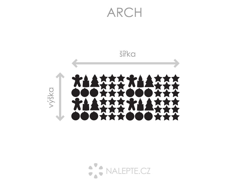 Arch = takto vám bude samolepka doručená. Každý prvok na archu je samostatná samolepka, jednotlivé části jednoduše od papírového podkladu odlepíte a nalepíte na cílové místo tak, aby zložili výposledný motív podľa Vašich predstáv. Arch si môžte prehliada'a vo fotogalérii. Rozmer archu volíte v objednáke. Prehľad preddefinovaních rozmerov (šírka x výška): a) hárok 30 x 13 cm b) hárok 50 x 22 cm c) hárok 75 x 32 cm d) hárok 120 x 52 cm Je možné zvoliť aj ľubovoľneý vlastní rozmer hárku pomocí posuvníku alebo klikání na "Vetší", "Menší" Hlavním zámerom je tieto samolepky lepi na okno. Použií materiál má zvolenú farbu ako z horní, tak aj zo spodní strany, na ktoré je lepidlo. Samolepka umístená na okne má teda rovnakú Vámi zvolenú farbu pri pohľade z interiéru aj exteriéru. Samolepky sú určené na jednorázové použitie, ale je možné, že vzhľadom na jednoduchosť motívu sa Vám je podarí odlepiť a použít opätovne na Vánoce aj príští rok, pokiaľ sa o to chcete pokúsiť, uschovajte si podkladový papír, na ktorém boli doáne.