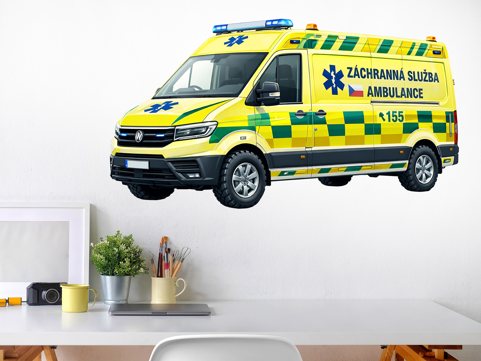 Samolepka na stenu „Sanitka“ priáší do detskej izby alebo herného kútika realisticky spracované; motív moderní záchranárské sanitky v typickém žlto-zeleném prevedí, ktoré deti dobre poznajú. z reálného sveta. Detailní ilustrácie vozidla záchranné služby s výraznými prvkami, ako sú svetelné majáky, označení „Záchranná služba“ a tísňová linka 155, podporuje detskú fantáziu, hru na záchranáre a prirodzený zájem o pomoc druhým. Díky čistému štýlu a profesionálnemu vzhľadu samolepka pôsobí výrazne, ale zároveň harmonicky zapadne do interiéru a stane sa dominantním vizuálním prvkom, ktorý poteší malé obdivovatel'a sanitních vozidiel a sveta integrovaného záchranného systému.