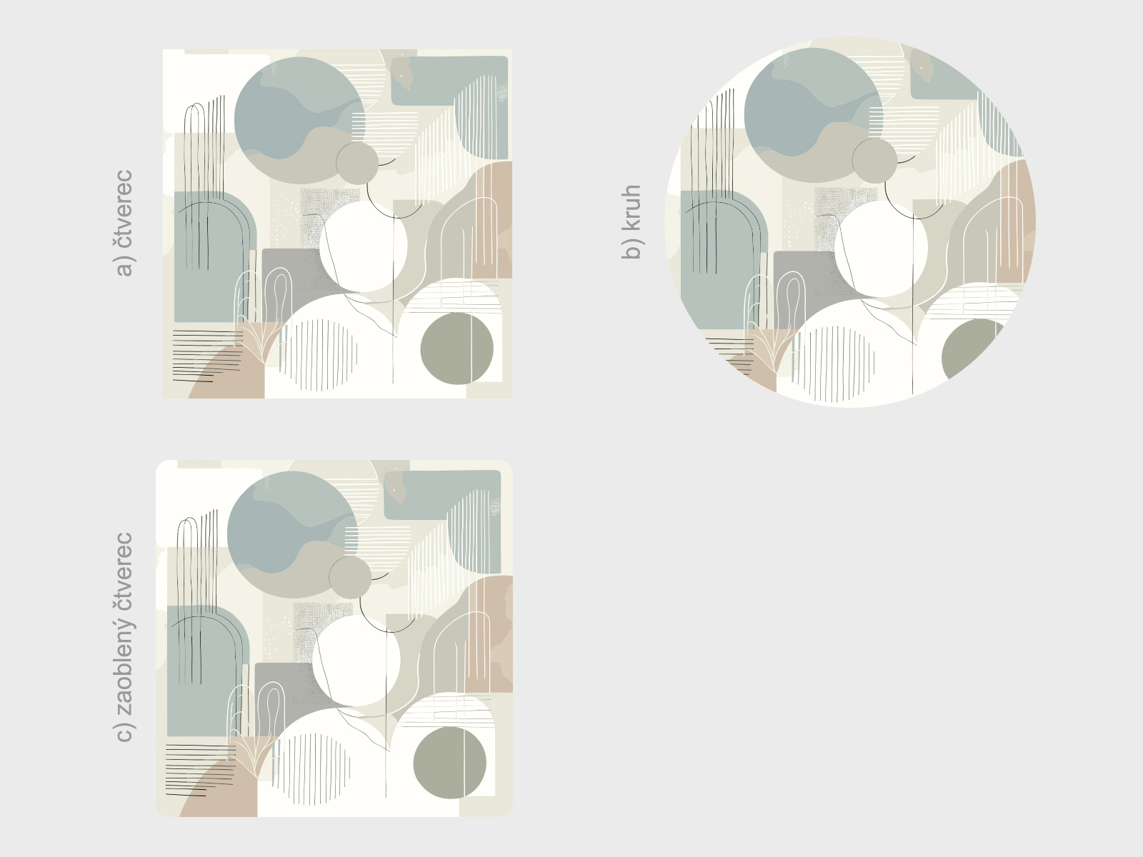 Tvar je možné zmeniť. Možno vybrať a) štvorec, b) kruh, c) zaoblený štvorec viď fotogaléria. Ak teda máte zájem o iný tvar ako na hlavní fotografiu, stačí v posledním kroku objednávky do pola poznámka napísa napr. "štvorec". Jedná sa o tištený samolepící plakát - imitácia maľby Je možné zvoliť aj ľubovoľneý vlastní rozmer hárku pomocí posuvníku alebo klikání na "Vetší", "Menší"