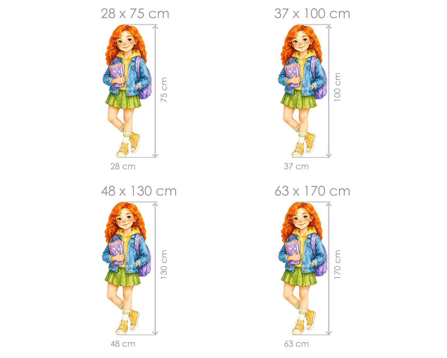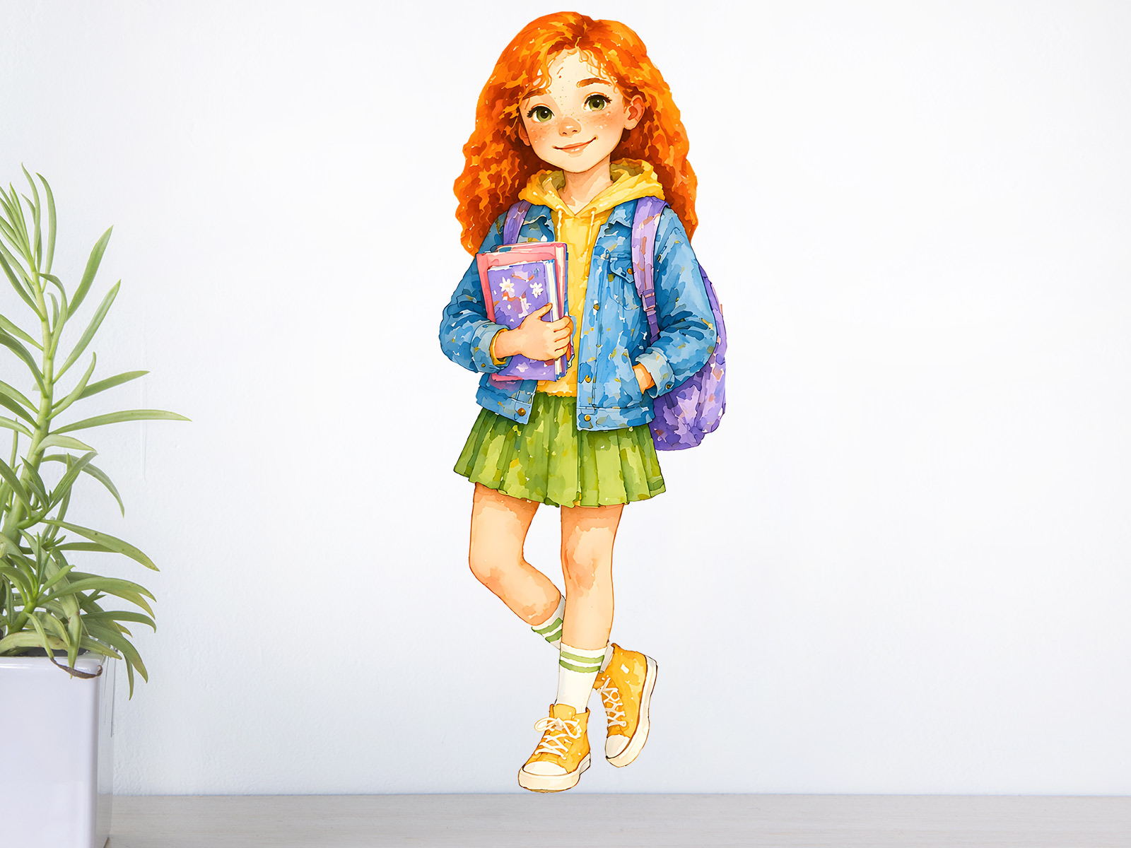 Nálepka na stenu „Ryšavá školáčka“ zaujme na prvý pohľad svojimi výraznými ryšavými vlasmi, jemnými pehami a priateľským úsmevom. Pôsobí živým a radostným dojmom a vnáša do detskej izby pozitívnu energiu aj hravú atmosféru. Akvarelové spracovanie dodáva ilustrácii jemnosť a prirodzenosť. Jemné farebné prechody, detailne prepracované oblečenie a doplnky, ako je batoh a knihy, vytvárajú harmonický celok, ktorý pôsobí útulne a esteticky čistým dojmom. Motív je ideálny do študijného kútika, nad písací stôl alebo na stenu v detskej izbe, kde môže slúžiť ako milá motivácia k školským aktivitám aj tvorivosti. Skvelá voľba pre malé školáčky, ktoré majú rady jemný štýl, farby a inšpiratívne prostredie okolo seba.
