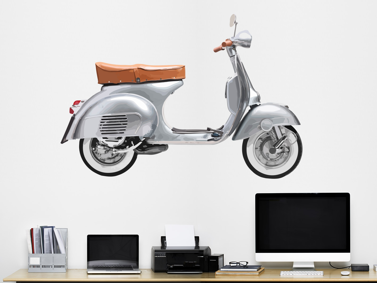 Samolepka na stenu „Skútr Vespa“ priáší do interiéru nadčasový talianský štýl, µahkosť a atmosféru bezstarostních prejížďak úskými uličkami historických miest. Elegantní silueta klasického skútra s jemnými krivkami, kovovo stríbrním prevedením a hnedým sedlom pôsobí vkusne, čisto a veľmi harmonicky, takže sa skvele hodí ako do moderních, tak aj retro ladených priestorov. Motív evokuje slobodu, cestování a životní pohodu a dokáže doda místnosti osobitý charakter – nech už ide o obývací izba, pracovňu, kaviareň alebo štýlový izba teenagera. Skúter je spracován s dôrazom na detail a proporcie, diíky, čomu na stene pôsobí prirodzene a ako výrazný dizajnový prvok, ktorý poteší milovníky motorizmu aj talianské estetiky.