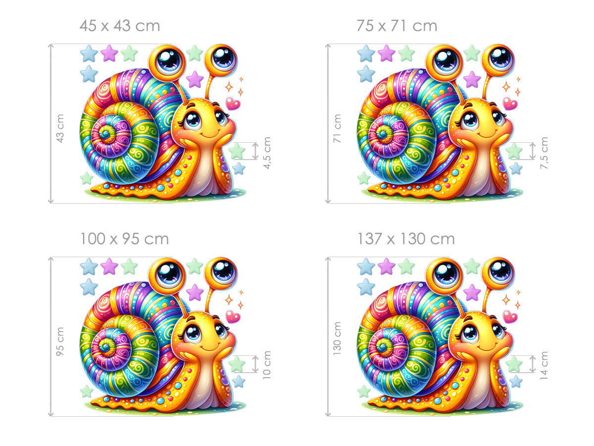 Tieto nálepky na stenu sú ideálne do detskej izby, herne alebo kútika na hranie. Vďaka svojim jasným farbám krásne oživujú interiér a môžu sa stať hlavnou dekoráciou celej steny. Slimák sa dobre hodí k iným detským motívom, ako sú hviezdy, mraky alebo zvieratá, a pomáha vytvoriť hravé a fantazijné prostredie.