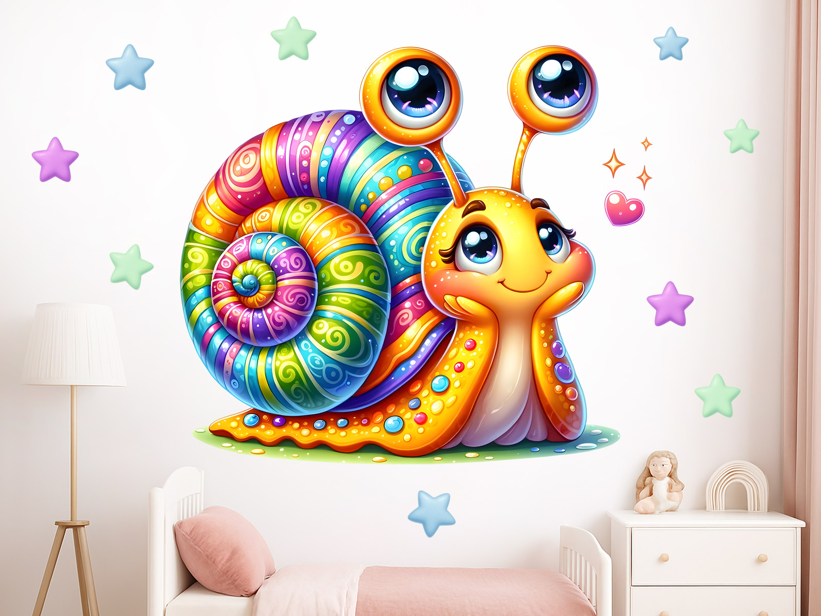 Táto nálepka na stenu s roztomilým slimákom je veselá a hravá dekorácia, ktorá rozžiari každú detskú izbu. Farebná ulita, plná dúhových odtieňov a jemných vzorov, vytvára na stene nápadný, ale veľmi priateľský motív. Veľké žiarivé oči a milý úsmev dodávajú slimákovi rozprávkový vzhľad, ktorý okamžite zaujme deti a vytvorí v izbe radostnú atmosféru.