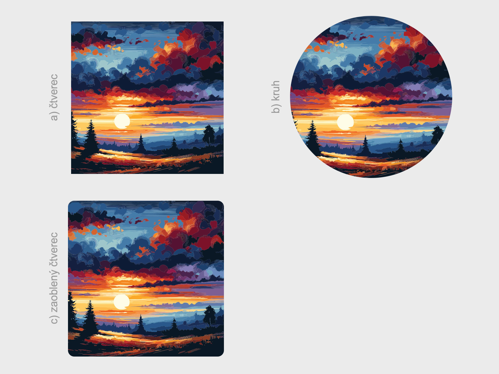Tvar je možné zmeniť. Možno vybrať a) štvorec, b) kruh, c) zaoblený štvorec viď fotogaléria. Ak teda máte zájem o iný tvar ako na hlavní fotografiu, stačí v posledním kroku objednávky do pola poznámka napísa napr. "kruh". Jedná sa o tištený samolepící plakát - imitácia maľby Je možné zvoliť aj ľubovoľneý vlastní rozmer hárku pomocí posuvníku alebo klikání na "Vetší", "Menší"