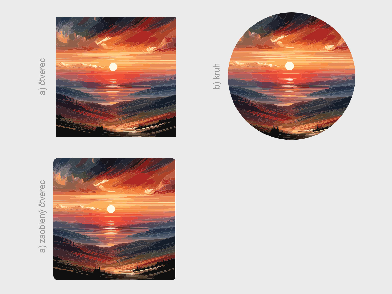 Tvar je možné zmeniť. Možno vybrať a) štvorec, b) kruh, c) zaoblený štvorec viď fotogaléria. Ak teda máte zájem o iný tvar ako na hlavní fotografiu, stačí v posledním kroku objednávky do pola poznámka napísa napr. "kruh". Jedná sa o tištený samolepící plakát - imitácia maľby Je možné zvoliť aj ľubovoľneý vlastní rozmer hárku pomocí posuvníku alebo klikání na "Vetší", "Menší"