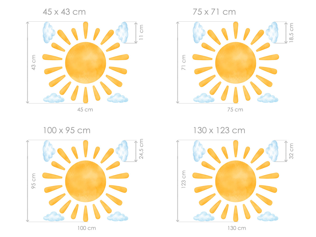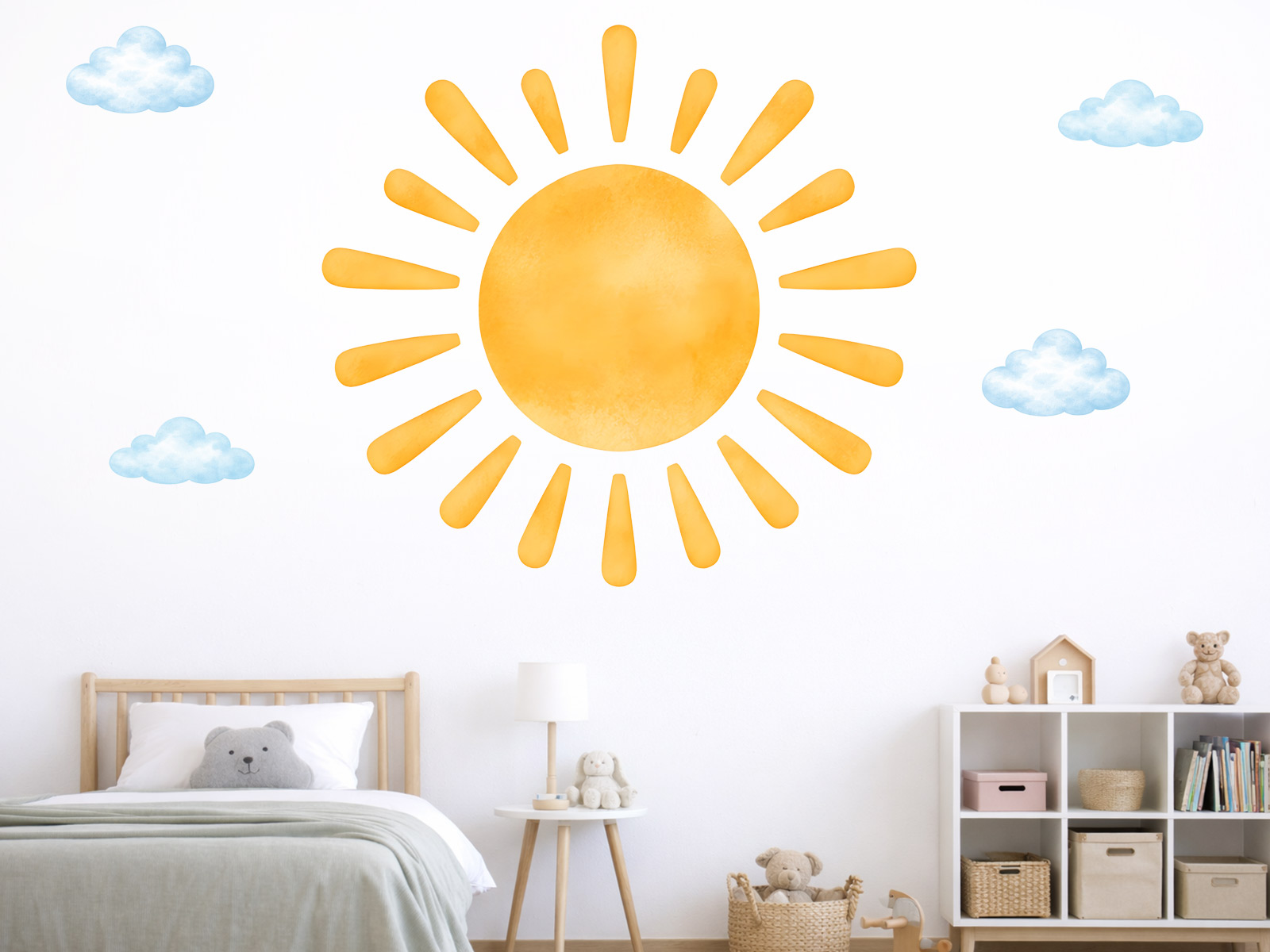 Samolepka na stenu „Slnko“ prinesie do detskej izby pocit tepla, radosti a pohody. Jemne malované slníčko s mäkk&´mi lúčmi a dopĺňajícími obláčkami pôsobí prívetivo, pokojne a harmonicky, takže krásne zapadne do interiéru pre bábätká aj vetší deti. Akvarelový štýl v teplých žltých tónech podporuje pozitívneí atmosféru a vytvára&´ útulné prostredí ideální pre odpočinok, hraní aj usínání. Samolepka je navrhnutá tak, aby bola výrazným, ale zároveň nežným prvkom, ktorý rozjasní celý priestor a dodá mu veselý, snový charakter.