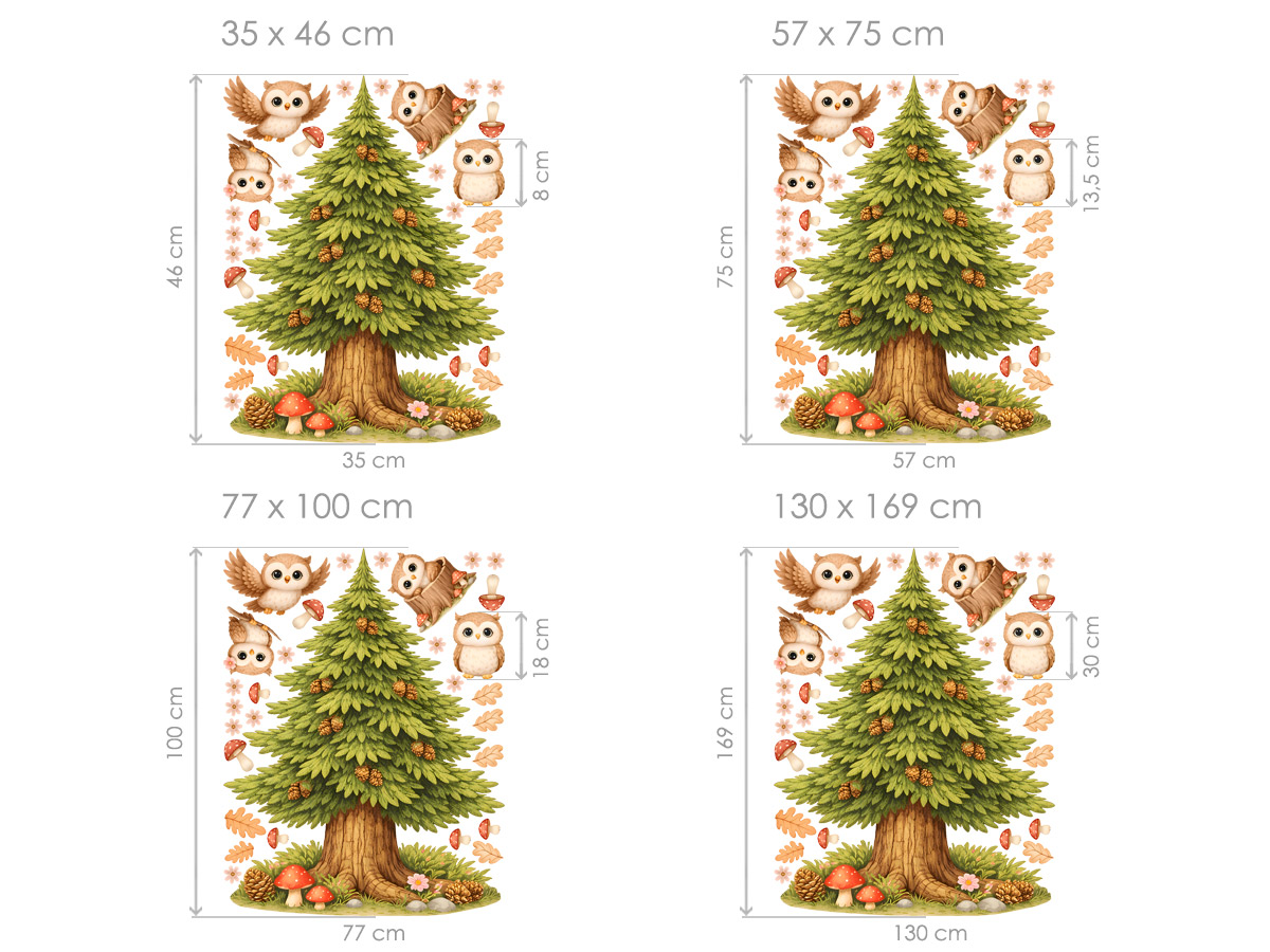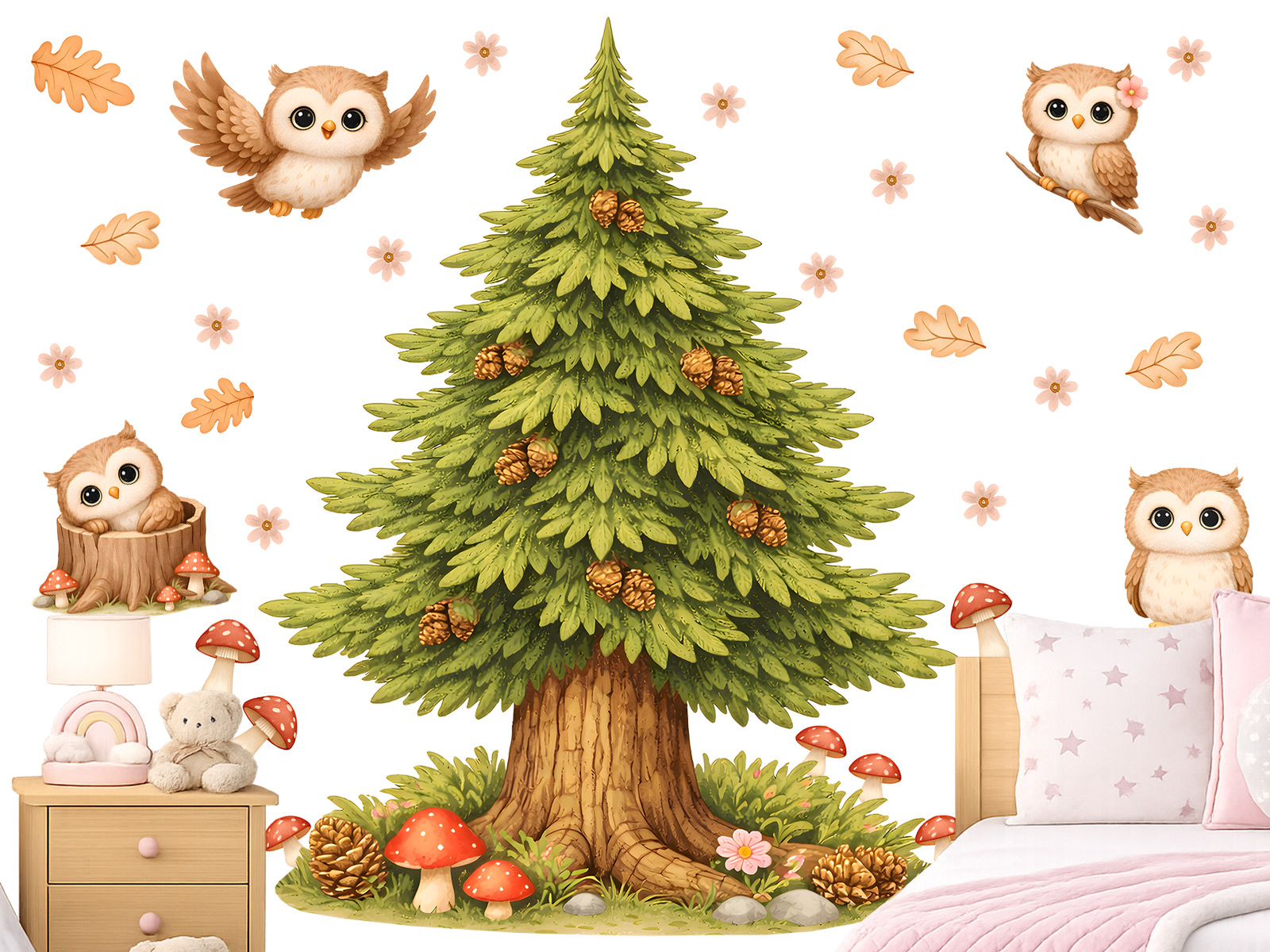 Samolepka na stenu Smrek a malej sovy prináša do detskej izby kúzlo lesnej prírody v jemnom a hravom poňatí. Dominantný ihličnatý strom dopĺňajú roztomilé malej sovy, ktoré pôsobia milo a vytvárajú príjemnú, upokojujúcu atmosféru. Detailne spracovaný smrek so šiškami spolu s drobnými prvkami ako sú hubky, kvietky a padajúce lístky vytvára harmonickú kompozíciu inšpirovanú lesom. Prírodná farebnosť v odtieňoch zelenej, hnedej a jemne oranžovej krásne zapadne do detského interiéru a navodí pocit útulnosti. Vďaka samostatným prvkom si môžete sovičky aj doplnky rozmiestniť podľa vlastných predstáv a prispôsobiť tak dekorácii konkrétnemu priestoru – nad posteľ, ku komode alebo na celú stenu. Ideálna dekorácia pre deti, ktoré majú rady zvieratká a pokojnú atmosféru lesa.