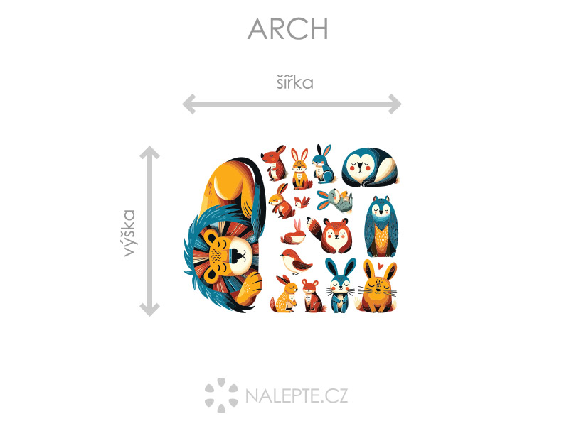 Arch = takto vám bude samolepka doručená. Každý prvok na archu je samostatná samolepka, jednotlivé části jednoduše od papírového podkladu odlepíte a nalepíte na stenu tak, aby zložili výposlední motív podľa Vašich predstáv. Arch si môžte prehliada'a vo fotogalérii. Rozmer archu volíte v objednáke. Prehľad preddefinovaních rozmerov (šírka x výška): a) hárok 45 x 35 cm b) hárok 75 x 58 cm c) hárok 100 x 78 cm d) hárok 153 x 120 cm Je možné zvoliť aj ľubovoľneý vlastní rozmer hárku pomocí posuvníku alebo klikání na "Vetší", "Menší"