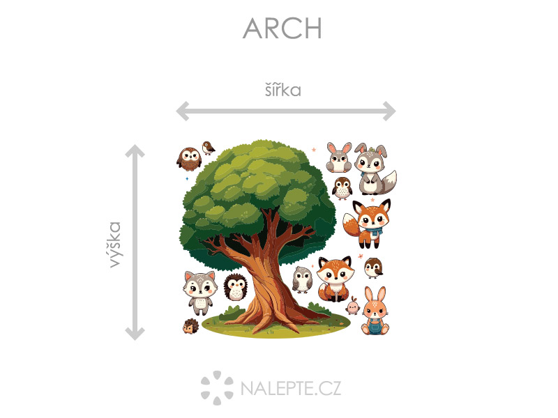 Arch = takto vám bude samolepka doručená. Každý prvok na archu je samostatná samolepka, jednotlivé části jednoduše od papírového podkladu odlepíte a nalepíte na stenu tak, aby zložili výposlední motív podľa Vašich predstáv. Arch si môžte prehliada'a vo fotogalérii. Rozmer archu volíte v objednáke. Prehľad preddefinovaních rozmerov (šírka x výška): a) hárok 45 x 41 cm b) hárok 75 x 68 cm c) hárok 100 x 90 cm d) hárok 144 x 130 cm Je možné zvoliť aj ľubovoľneý vlastní rozmer hárku pomocí posuvníku alebo klikání na "Vetší", "Menší"