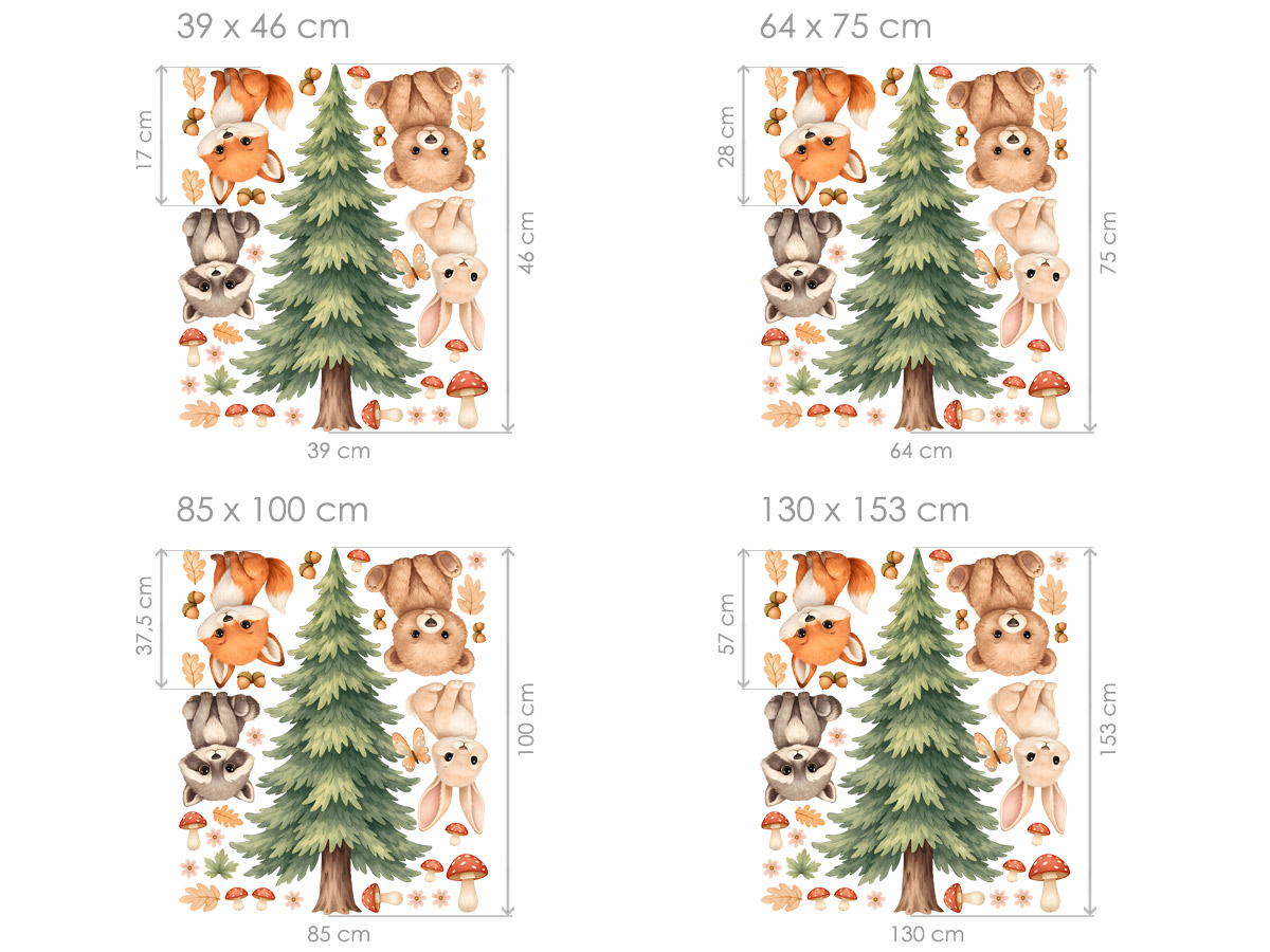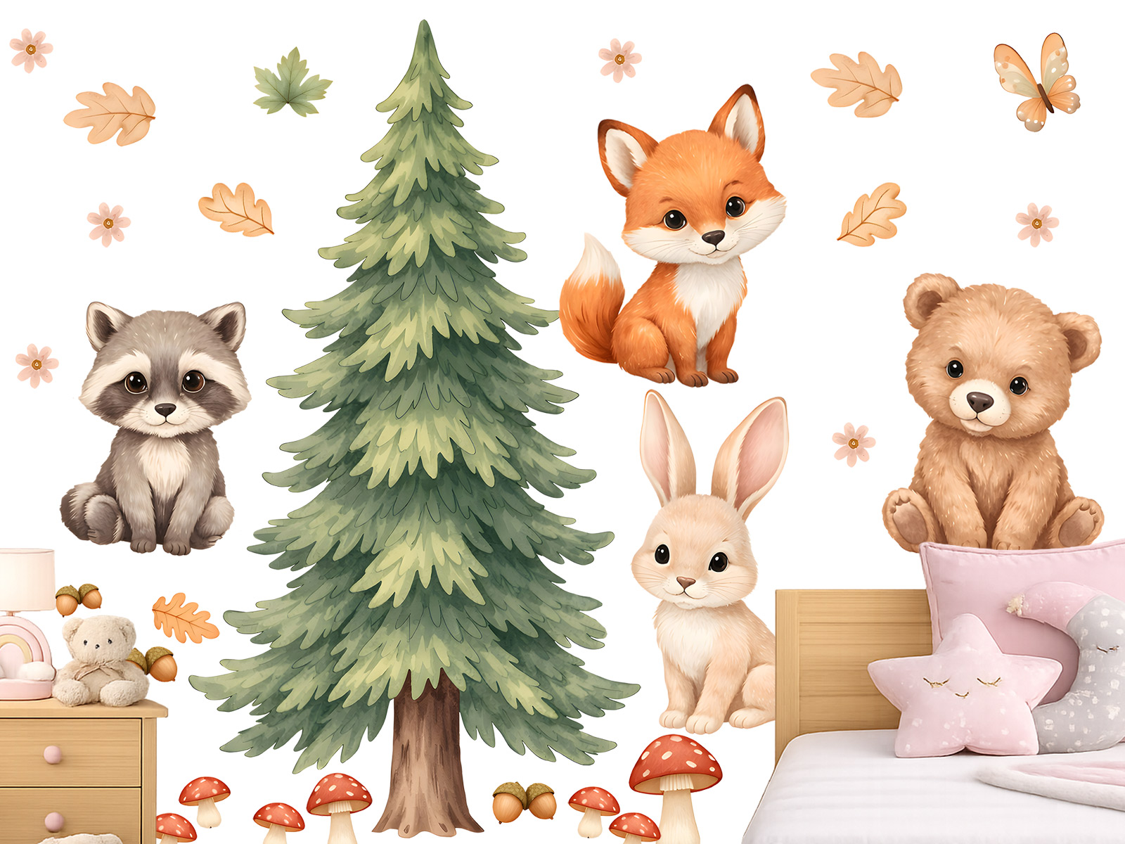 Nálepky na stenu „Strom a lesné zvieratká“ vytvárajú nádhernú prírodnú scenériu, ktorá premení detskú izbu na čarovný lesný svet. Dominantným prvkom je veľký ihličnatý strom, okolo ktorého sa rozprestierajú roztomilé zvieratká – líška, medvedík, zajačik a mýval. Celý motív dopĺňajú jemné detaily ako huby, žalude, lístky a kvietky, ktoré dekorácii dodávajú hravosť a prirodzený lesný charakter. Farebnosť je ladená do teplých prírodných tónov, ktoré pôsobia upokojujúco a harmonicky. Vďaka väčšiemu centrálnemu stromu a samostatným zvieratkám si môžete vytvoriť vlastnú kompozíciu presne podľa priestoru. Ideálne je umiestnenie na väčšiu stenu, kde motív krásne vynikne a vytvorí útulné prostredie plné fantázie a dobrodružstva.
