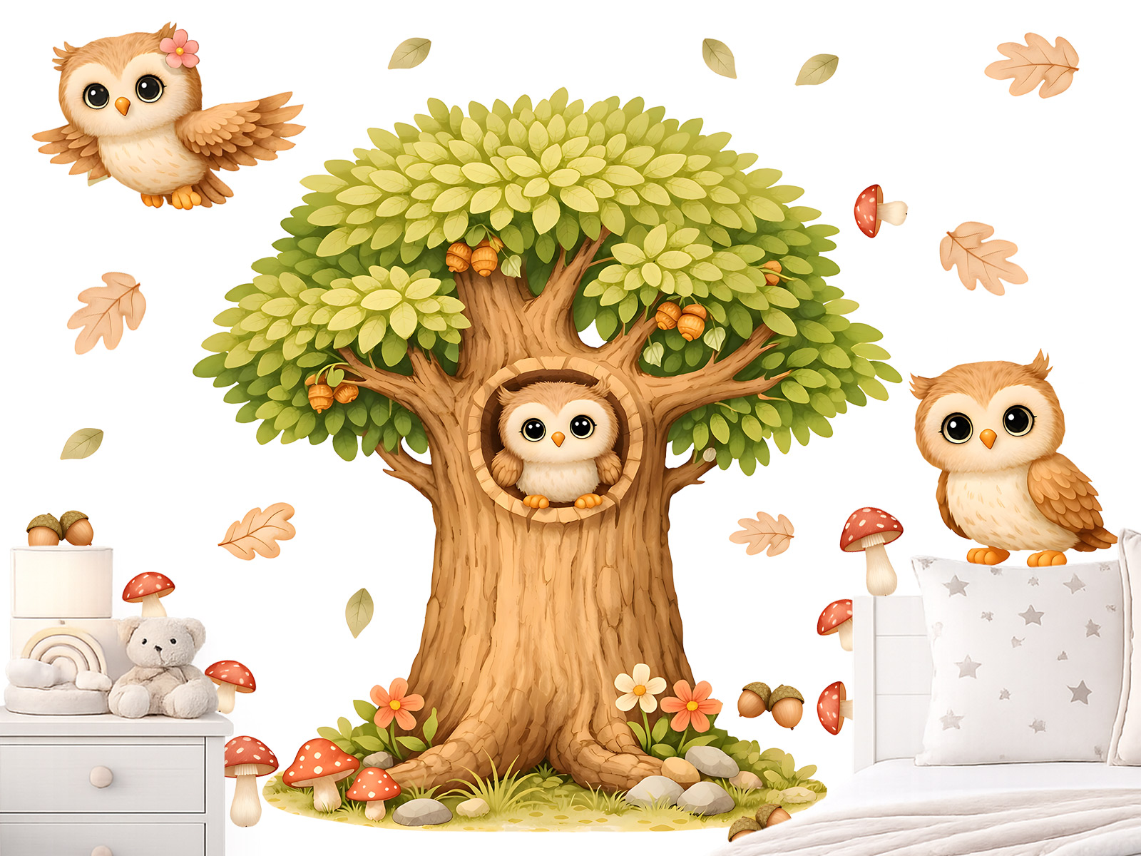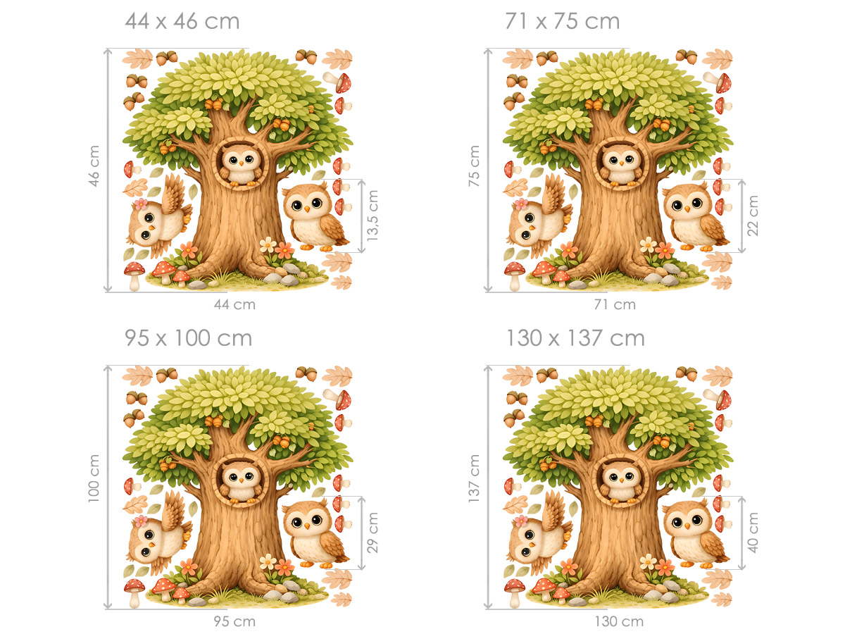 Samolepka na stenu Strom a malej sovy vytvára v detskej izbe kúzelnú lesnú scenériu plnú pokoja a pohody. Dominantný strom s bohatou korunou dopĺňajú roztomilé malej sovy, ktoré pôsobia milo a priateľsky a dodávajú celej kompozícii hrejivý charakter. Prírodné tóny zelenej, hnedej a jemných béžových odtieňov navodzujú harmonickú atmosféru inšpirovanú prírodou. Detaily ako žalude, hubky a padajúce lístky dodávajú motívu hravosť a zároveň pocit útulnosti, ktorý je ideálny pre detskú izbičku. Jednotlivé prvky je možné ľahko rozmiestniť podľa vlastného priestoru, takže si vytvoríte originálnu dekoráciu presne na mieru – okolo postieľky, nad posteľ alebo na väčšiu plochu steny. Ideálna voľba pre deti, ktoré milujú zvieratká a pokojnú atmosféru lesa.