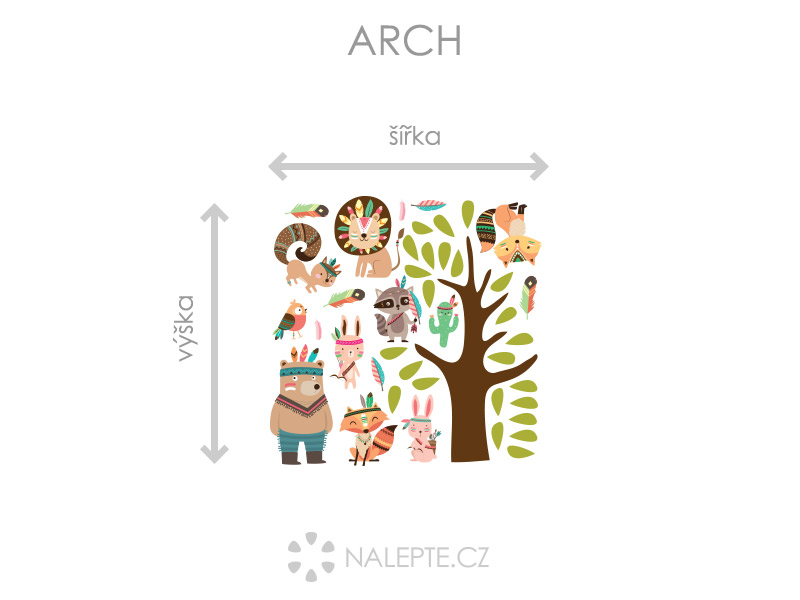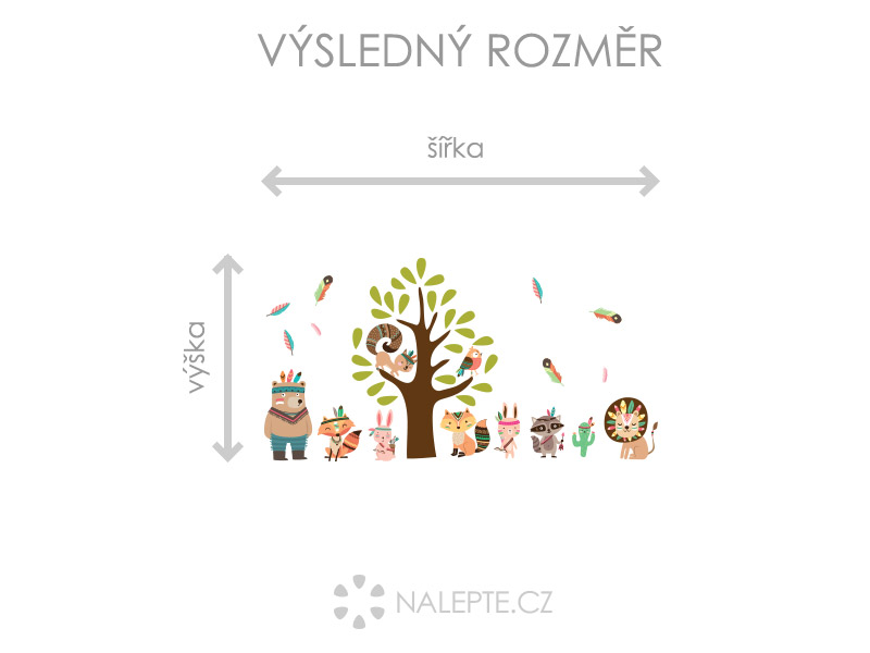 Výposledný rozmer = rozmer po nalepení na stenu podľa hlavní produktové fotografie (samozrejme môžete rozlepiť prvky úplne ľubovoľne a získáte úplne iné výposledné rozmery). Arch = takto vám bude samolepka doručená. Z hárku jednotlivé části odlepíte a nalepíte na stenu tak, aby zložili výposledný motív podľa Vašich predstáv. Arch si môžte prehliada'a vo fotogalérii. Rozmer archu volíte v objednáke. Prehľad rozmerov (šírka x výška): - výposledný rozmer 140 x 69 cm = hárok 70 x 69 cm - výposledný rozmer 200 x 99 cm = hárok 100 x 99 cm - výposledný rozmer 264 x 130 cm = hárok 132 x 130 cm Výška stromu odpovedídá výške hárku. Okúzlite své deti roztomilími a veselými samolepkami na stenu s motívom Strom a zvírka indiánej. Každé zvírátko má svoj vlastní indiánský vzh&ad, čo vytváraí hravú a dobrodružnú atmosféru. Farebneé samolepky pridají do detskej izby veľa života a radosti. Samolepky sú vyrobené z kvalitního materiálu a môzete ich umístit, kamkolvek chcete. Možnos zmeny veľkosti a zrkadlového otočení.
