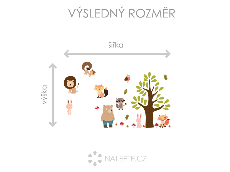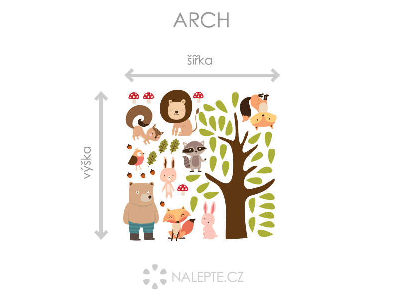 Výposledný rozmer = rozmer po nalepení na stenu podľa hlavní produktové fotografie (samozrejme môžete rozlepiť prvky úplne ľubovoľne a získáte úplne iné výposledné rozmery). Arch = takto vám bude samolepka doručená. Z hárku jednotlivé části odlepíte a nalepíte na stenu tak, aby zložili výposledný motív podľa Vašich predstáv. Arch si môžte prehliada'a vo fotogalérii. Rozmer archu volíte v objednáke. Prehľad rozmerov (šírka x výška): - výposledný rozmer 126 x 82 cm = hárok 70 x 69 cm - výposledný rozmer 180 x 119 cm = hárok 100 x 99 cm - výposledný rozmer 237 x 156 cm = hárok 132 x 130 cm Výška stromu aj s listami odpovedídá výške hárku.
