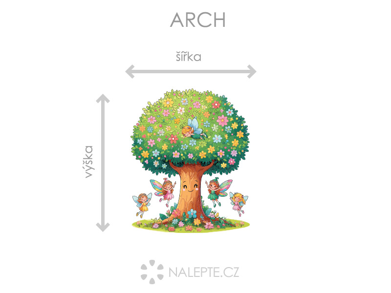 Arch = takto vám bude samolepka doručená. Každý prvok na archu je samostatná samolepka, jednotlivé části jednoduše od papírového podkladu odlepíte a nalepíte na stenu tak, aby zložili výposlední motív podľa Vašich predstáv. Arch si môžte prehliada'a vo fotogalérii. Rozmer archu volíte v objednáke. Prehľad preddefinovaních rozmerov (šírka x výška): a) hárok 39 x 47 cm b) hárok 62 x 75 cm c) hárok 83 x 100 cm d) hárok 120 x 145 cm Je možné zvoliť aj ľubovoľneý vlastní rozmer hárku pomocí posuvníku alebo klikání na "Vetší", "Menší" Roztomilý detský motív stromu s vílami a kvetinkami sa bude hodiť do detských izieb tých najmenších, kde vytvorí príjemnú veselú atmosféru.