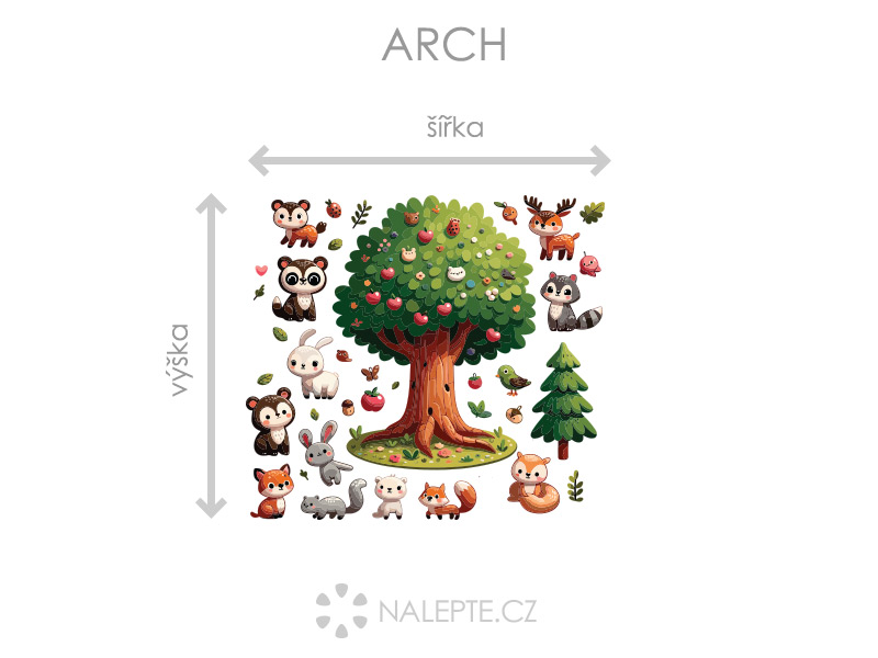 Arch = takto vám bude samolepka doručená. Každý prvok na archu je samostatná samolepka, jednotlivé části jednoduše od papírového podkladu odlepíte a nalepíte na stenu tak, aby zložili výposlední motív podľa Vašich predstáv. Arch si môžte prehliada'a vo fotogalérii. Rozmer archu volíte v objednáke. Prehľad preddefinovaních rozmerov (šírka x výška): a) hárok 45 x 41 cm b) hárok 75 x 68 cm c) hárok 100 x 90 cm d) hárok 143 x 130 cm Je možné zvoliť aj ľubovoľneý vlastní rozmer hárku pomocí posuvníku alebo klikání na "Vetší", "Menší"