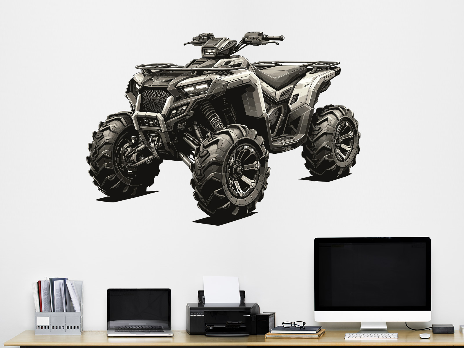Samolepka na stenu „Štýlová štvorkolka“ priáší do interiéru výraznú dávku síly, dobrodružstvoí a moderního dizajnu. Detailne spracovanéá štvorkolka s robustní konštrukcí, mohutními kolesami a technickým vzh&adpadom pôsobí dynamicky a realisticky, ako by bola pripravená. vyrazi† do terénu prímo zo steny. Díky čistému vykonaní a výrazným tvarom sa stane neprehlénutelným prvkom detského izby, herne alebo moderního pracovního kúta a osloví všetky milovníky akcních strojov, techniky a outdoorového štýlu. Motív podporuje fantáziu, chuť objavovať a dodává priestoru energiu aj osobitý charakter.