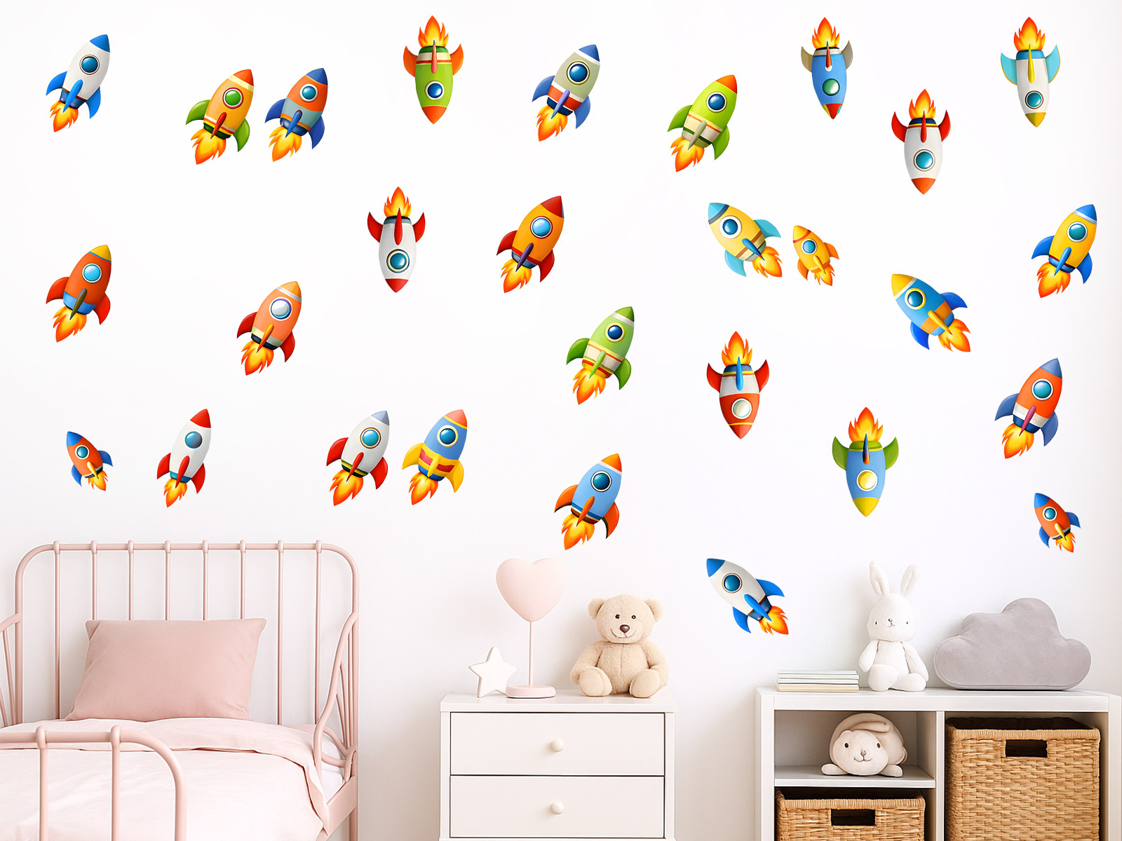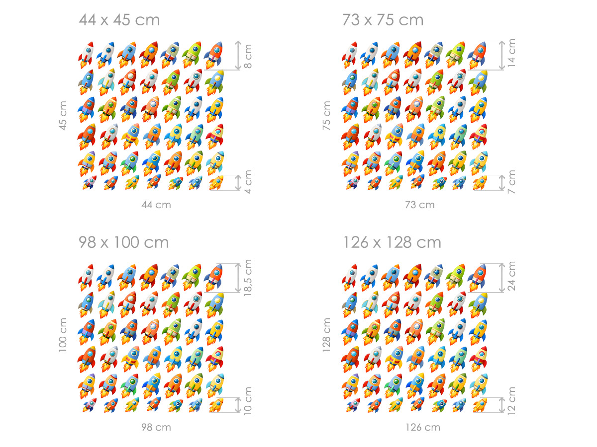 Samolepka na stenu „Sada 50 raketiek“ premení detský izba v hravý vesmír plný pohybu, farieb a nekonečných dobrodružstiev. Kolekcia obsahuje päťdesiatok rôznych rakiet v pestrých farebných kombináciách a odlišných tvaroch, ktoré; pôsobí dynamicky a hravo a umožňují vytvori originální kompozíciu presne podľa detské fantázie. Díky velkému množstvuí samostatných motívov je mo|né raketky rozpresít po celé steny, vytvoriť letovú formáciu, vesmírný prevádzka alebo len jemný dekoratívneí rozptyl nad posteľí či herním kútikom. Veselé ilustrácie podporují detskú predstavivos•, zájem o vesmír a prirodzene vyberí k hre aj vyprávení vlastních príbehov, díky, èo sa nálepka stane výrazním a zábavným prvkom každého detského interiéru.