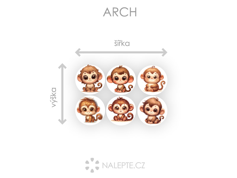 Arch = takto vám bude samolepka doručená. Každý prvok na archu je samostatná samolepka, jednotlivé části jednoduše od papírového podkladu odlepíte a nalepíte na stenu tak, aby zložili výposlední motív podľa Vašich predstáv. Arch si môžte prehliada'a vo fotogalérii. Rozmer archu volíte v objednáke. Prehľad preddefinovaních rozmerov (šírka x výška): a) hárok 47 x 40 cm b) hárok 75 x 63 cm c) hárok 100 x 85 cm d) hárok 153 x 130 cm Je možné zvoliť aj ľubovoľneý vlastní rozmer hárku pomocí posuvníku alebo klikání na "Vetší", "Menší" Každý kruh s opičkou má priemer odpovedídající jedé polovici výšky hárku