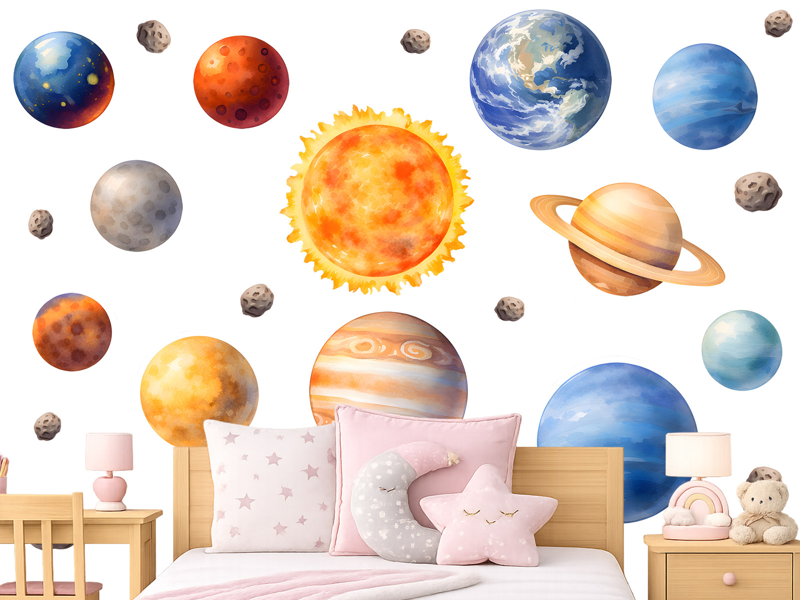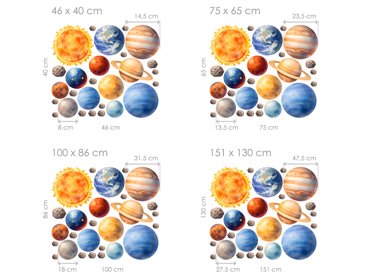 Samolepky na stenu Sada planét prenesú deti do kúzelne&ho sveta vesmíru plného planét, hviezd a dobrodružstva. Ilustrácia Slnko, planét i drobných asteroidov pôsobí hravo a pritom jemne, diíky čomu sa skvele hodí do detskej izby, herne alebo kútika pre malé objaviteľa. Samolepky je možné na stene ľubovoľne rozmístit, vytvoriť vlastní slneční sústavu alebo sa s de•mi hrát na vesmírnú mapu a povída† si o planetách. Farebnosť je zladená. tak, aby priestor zútulnila a zároveň podnecovala detskú fantáziu, zvedavosť a zájem o vesmír. Sada pôsobí ľahko a vzdušne, krásne doplí interiér a premení obyčajnú stenu v hravé místo plné snov o cestách medzi hviezdami.