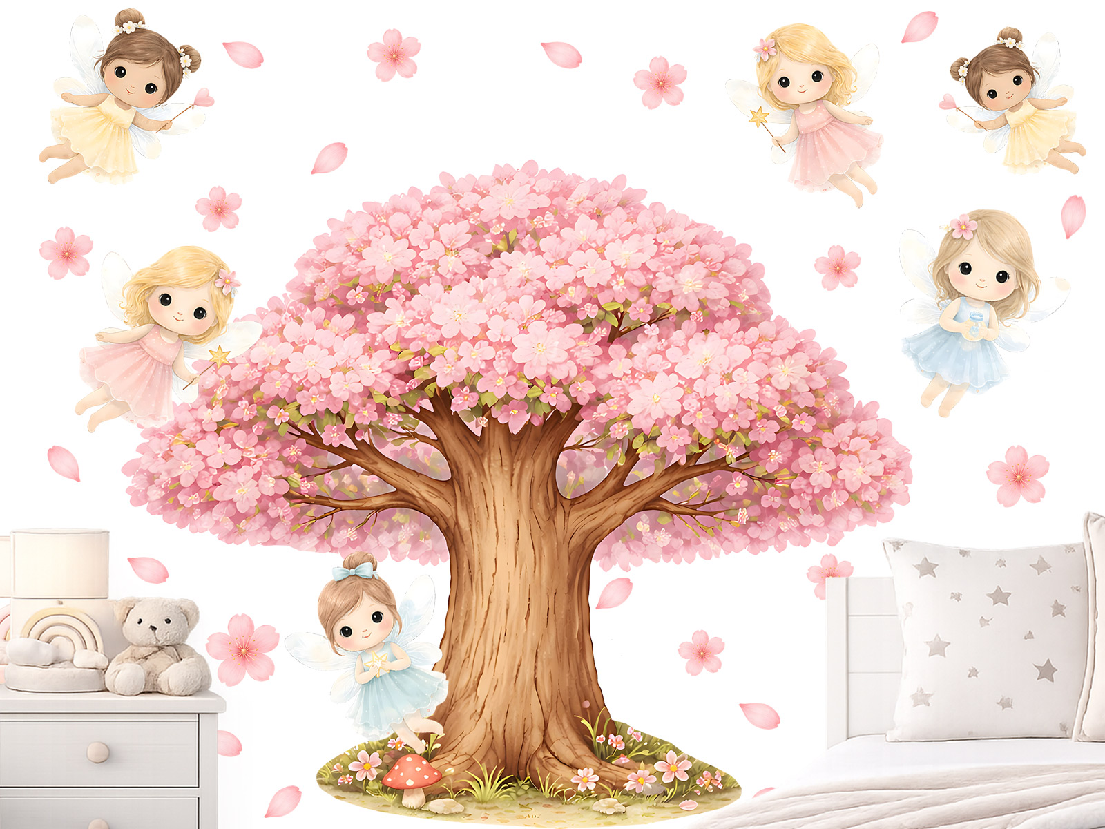 Samolepka na stenu Čerešňa a víly vnesie do detskej izby jemnú rozprávkovú atmosféru plnú kúziel a snívaní. Rozkvitnutý strom obsypaný ružovými kvetmi vytvára nežné prostredie, v ktorom poletujú malé víly s krehkými krídlami a milým výrazom. Celý motív pôsobí ľahko a vzdušne vďaka pastelovým odtieňom ružovej, béžovej a svetlo modrej. Padajúce okvetné lístky spolu s drobnými detailmi vytvárajú romantickú scénu, ktorá podnecuje detskú fantáziu a prináša pocit pokoja a pohody. Jednotlivé prvky je možné rozmiestniť podľa vlastných predstáv, takže si ľahko vytvoríte originálnu kompozíciu na mieru – nad posteľ, okolo postieľky alebo cez celú stenu. Ideálna dekorácia do izbičky malých víl a rojkov, ktorí milujú rozprávkové svety.