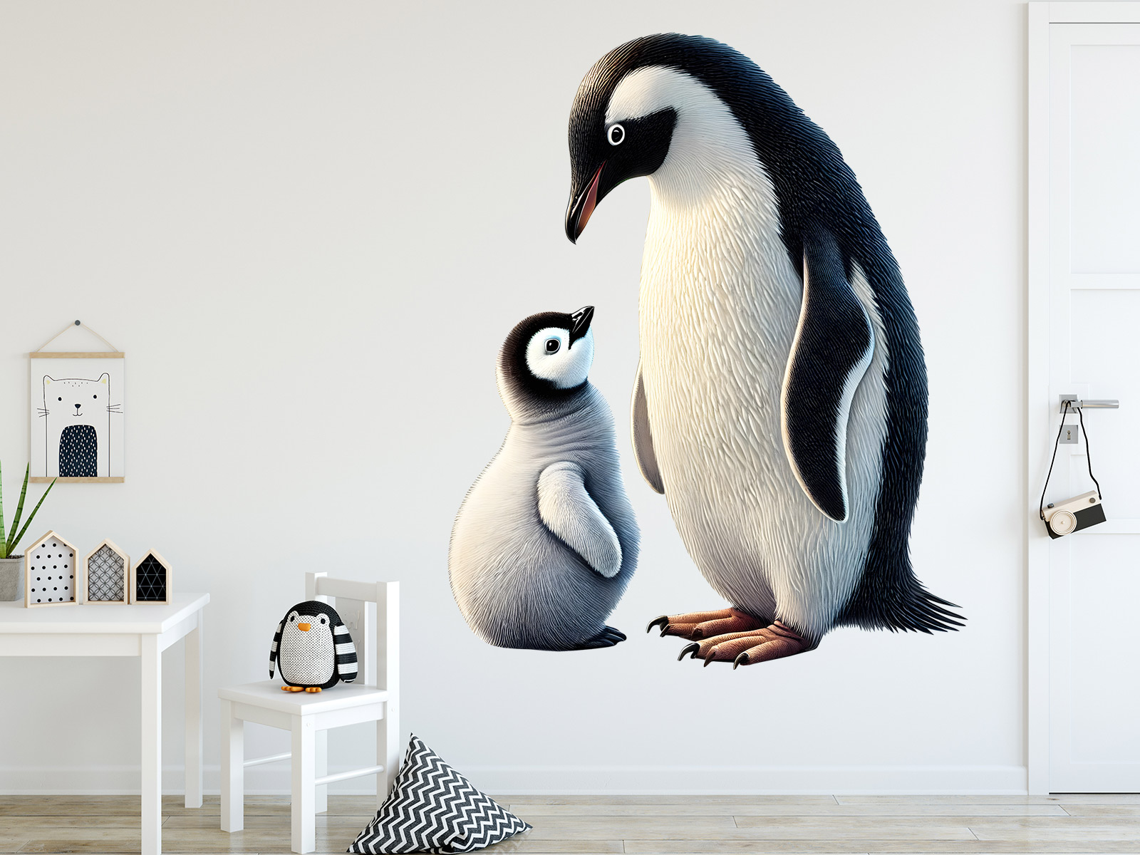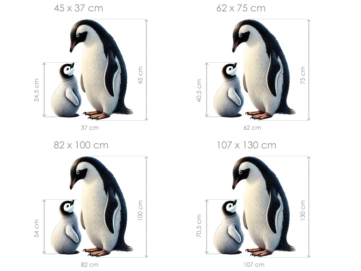 Samolepka na stenu „Tučňáci“ priáší do detskej izby jemnosť, kľud a kúzlo rodinného putá v podobe nežného stretnutia; dospelého tučnáka s mládetom. Motív pôsobí hrejivo a prátelsky, s dôrazom na detailneí spracování srsti, prirodzené proporcie a pokojnú farebnosť, ktorá sa ľahko zladí s moderním aj škandinávským interiérom. Motív vyvolává pocit bezpečí, blízkosti a vzájemné préče, diaíky, čomu je ideální voľbou pre detské izby, herne aj kľudové kútiky určené na odpočinok. Súčástí produktu je arch so samolepkou a náhladová vizualizácia, ktorá ukazuje, ako harmonicky motív pôsobí v priestore a pomáhá predstaviť si výposledný efekt v reálném interiéri.