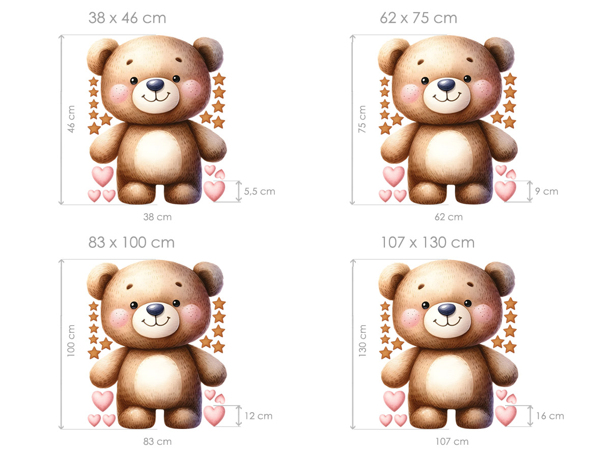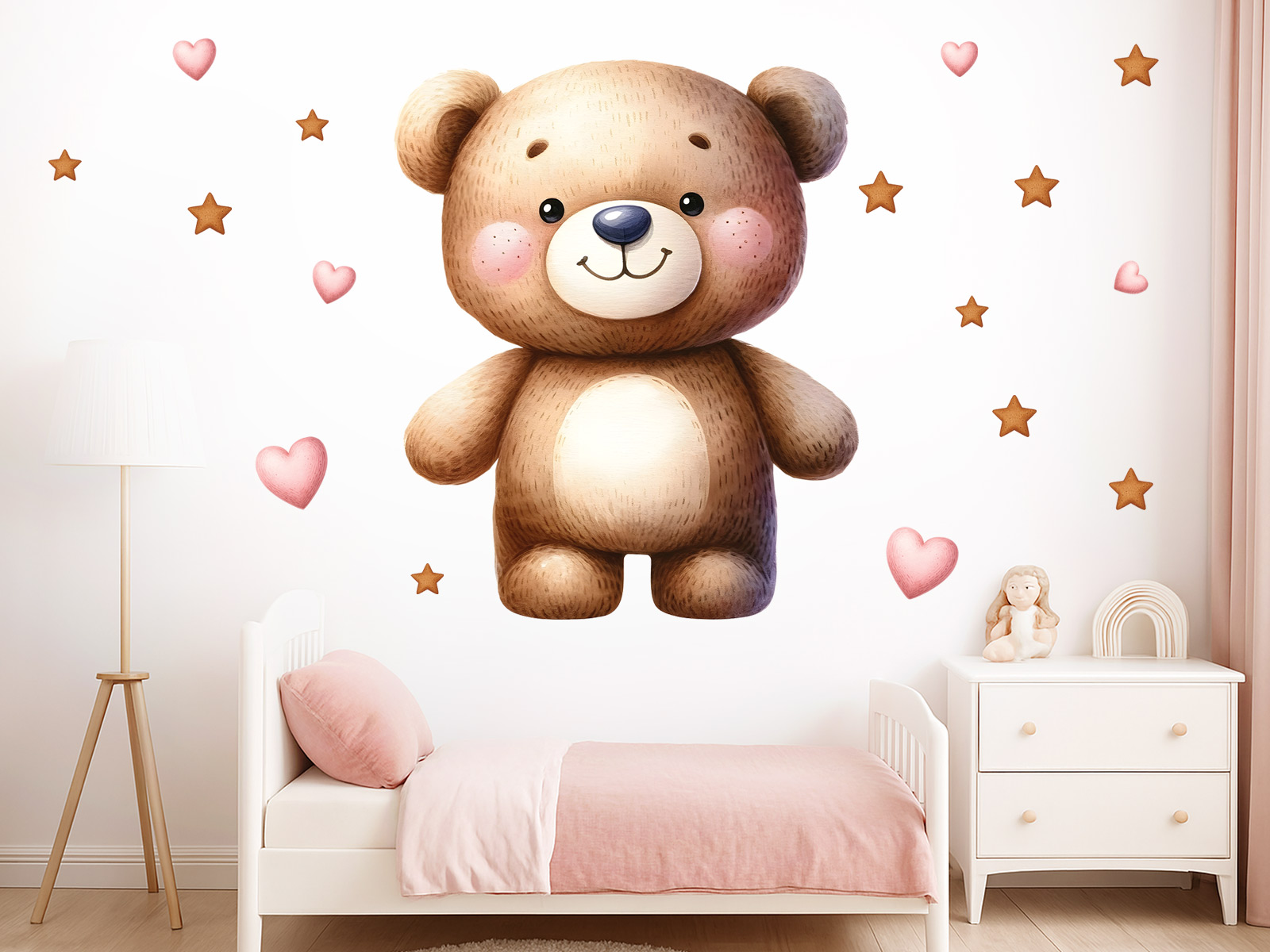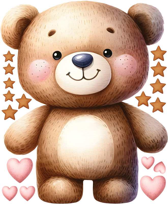 Samolepka na stenu „Usmievavý medvídek“ vnesie do detskej izby teplo, pokoj a pocit bezpečia. Tento roztomilý plyšový kamarád s láskavím úsmevom a hebkým kožíškom pôsobí hrejivo a priateľsky, takže sa okamžite stane oblíbeným spolo&níkom vašich najmenších. Jemné hnedé tóny a akvarelové spracování vytváraíriaí harmonickú atmosféru, ktorá skvele ladí s prírodními aj pastelovými odstíny interiéru. Arch obsahuje samotného medvediaka doplneného o sadu hviezdičiek a sŕdc, ktoré sú tvorené. dá sa ľubovoľne rozmiestniť na stenu podľa vlastnejí fantázie.