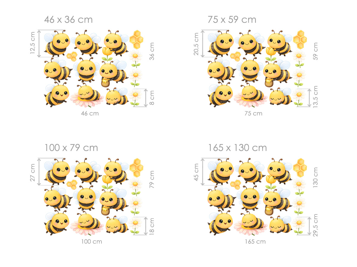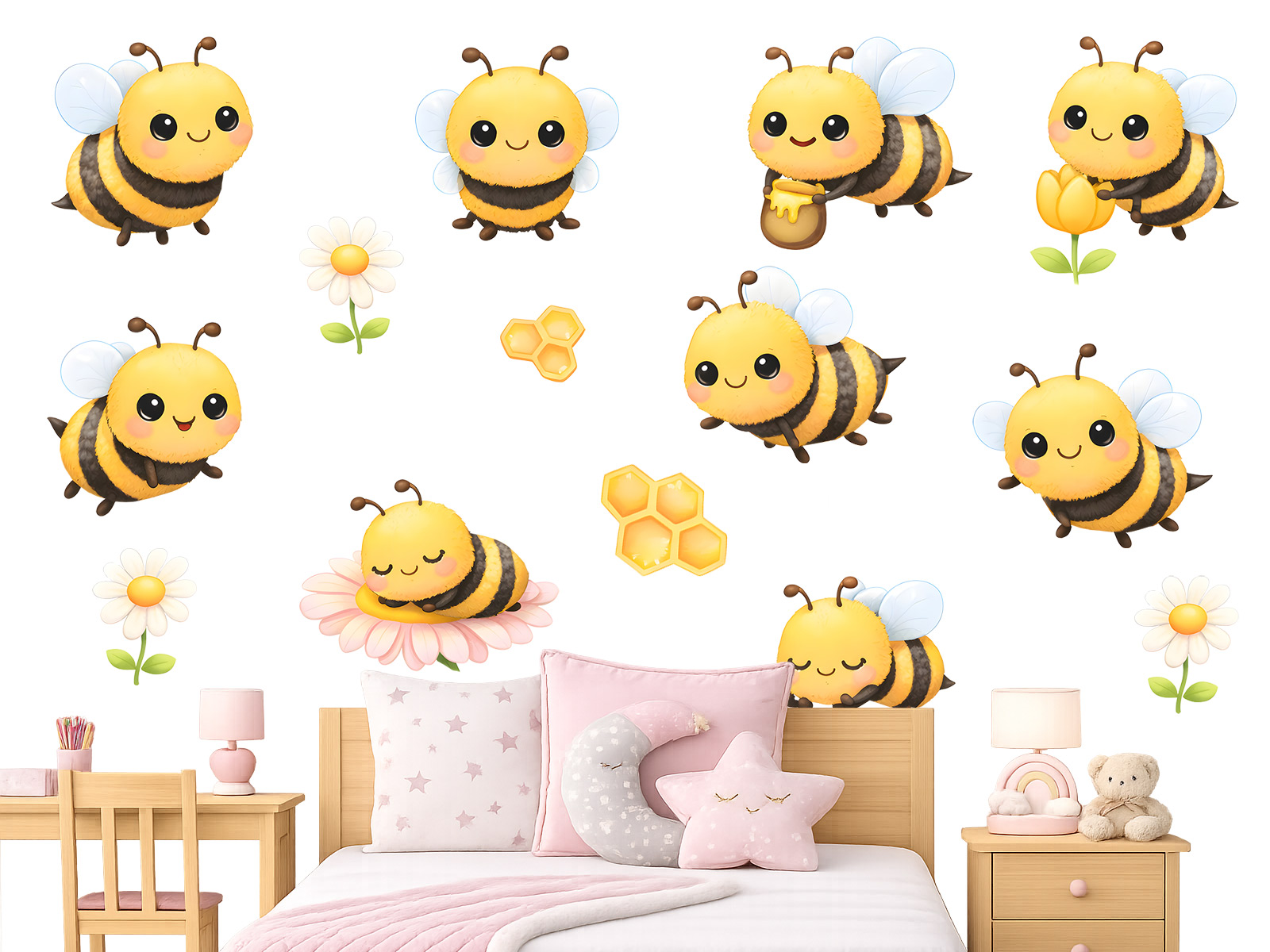 Roztomilé nálepky na stenu s veselými včielkami premenia detskú izbu na jemný svet plný pokoja, radosti a jemnej fantázie. Jemné akvarelové farby vytvárajú teplý a upokojujúci dojem, vďaka čomu je izba príjemným miestom na spanie, hranie a snívanie prvých snov. Usmievavé včielky poletujúce medzi kvetmi a plástami dodávajú priestoru pocit bezpečia, nežnosti a bezstarostného detstva. Celá kompozícia je navrhnutá tak, aby prebudila detskú fantáziu a naplnila izbu láskyplnou atmosférou, v ktorej sa vaše dieťa bude každý deň cítiť šťastné. Tento magický motív je ako tichá rozprávka na stene – jemná, sladká a plná malých radostí.