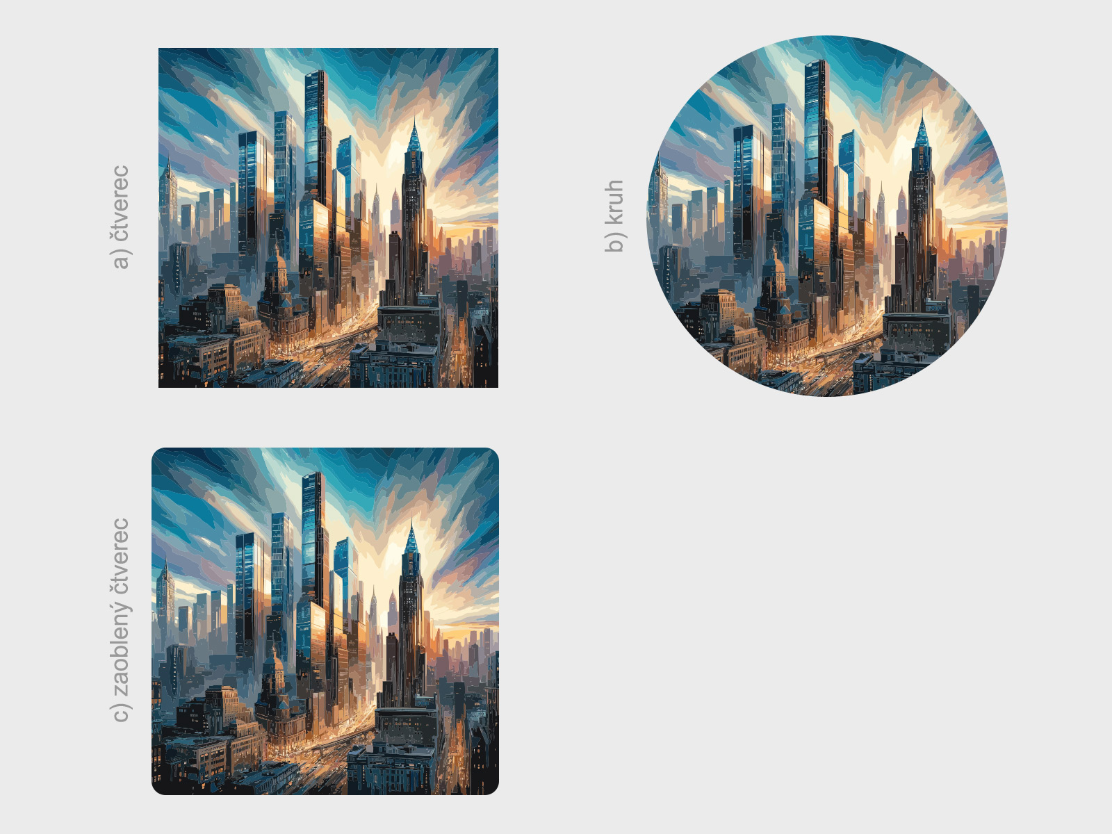 Tvar je možné zmeniť. Možno vybrať a) štvorec, b) kruh, c) zaoblený štvorec viď fotogaléria. Ak teda máte zájem o iný tvar ako na hlavní fotografiu, stačí v posledním kroku objednávky do pola poznámka napísa napr. "kruh". Jedná sa o tištený samolepící plakát - imitácia maľby Je možné zvoliť aj ľubovoľneý vlastní rozmer hárku pomocí posuvníku alebo klikání na "Vetší", "Menší"