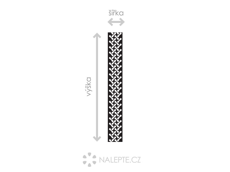 Táto originálna dekorácia je zaujímavým riešením interiérového dizajnu. Vertikálna dekorácia nielen zdobí, ale pomáha aj vizuálne rozdeliť priestor v miestnosti. Vždymá biele pozadie – bielu samolepiacu fóliu potlačenú vzorom vo farbe podľa vášho výberu. Môžete si zvoliť vlastné rozmery, t. j. výšku pásu je možné presne prispôsobiť výške vašej steny. Nie je možné zvoliť bielu farbu 010 ani jednu z metalických farieb: 090 strieborná, 091 zlatá, 092 medená. Ak si vyberiete jednu z týchto farieb, budeme vás kontaktovať ohľadom zmeny farby alebo zrušenia vašej objednávky.