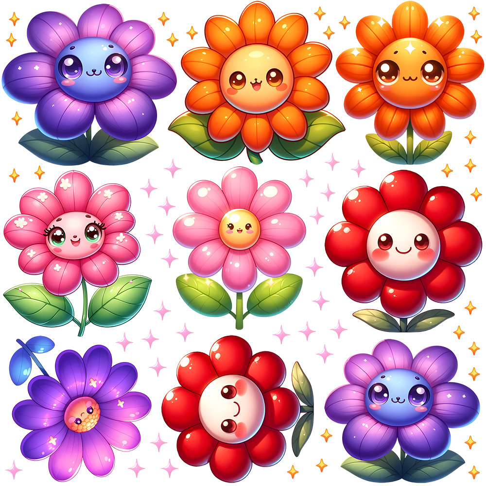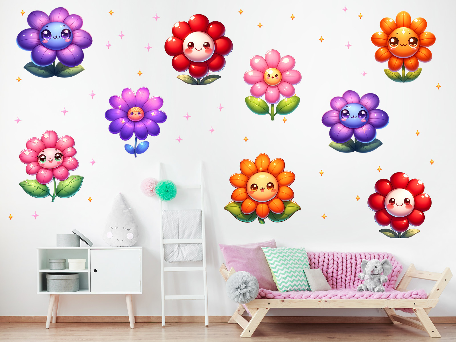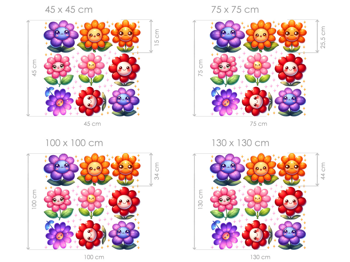 Samolepky na stenu „Veselé kvetinky“ priáší do detskej izby radosť, farby a očarujúce&cí atmosféru plnú úsmevov. Devä? roztomilích kvetiniek s milími tváríkami, jemným leskom a pest&´mi lískami vytvára&´ hravý a priátelský motív, ktorý rozvíjí fantáziu a zútulňuje každý priestor. Farebneá paleta sahá od pastelových ružových tónov až po sýté fialové, oranžové a červené odstíny, takže dekorácia pôsobí naživo a harmonicky zároveň. Súčástí hárku sú také drobné trblietavé hviezdičky, ktoré dotvárejí kúzelnú atmosféru a umožňují kreatívneí rozmístení poda vlastnejího štýlu. Táto veselá sada kvetiniek okamžite rozjasní místnos a vytvorí príjemné prostredí, v ktorém sa deti budú cítit šťastne a spokojne.
