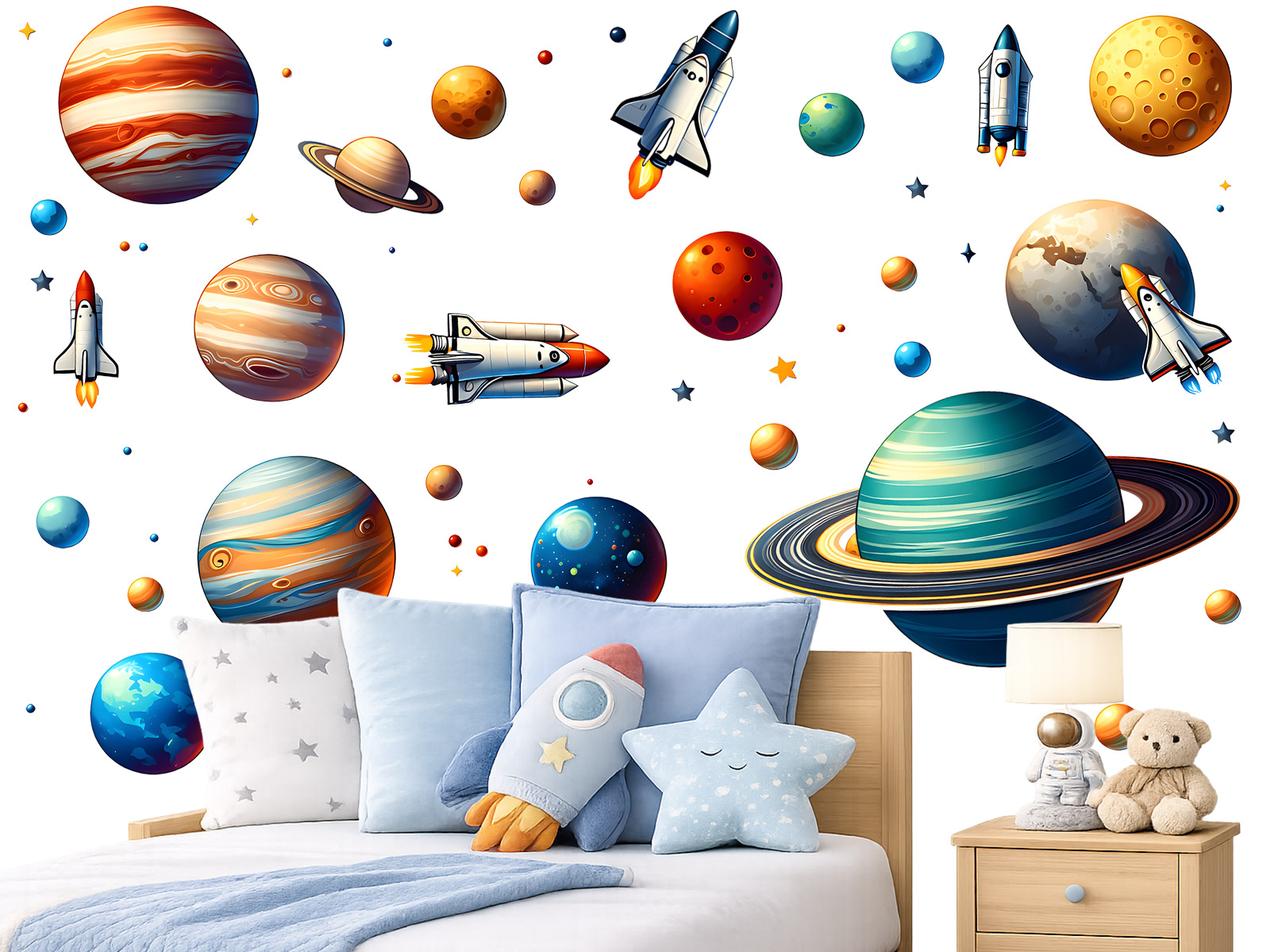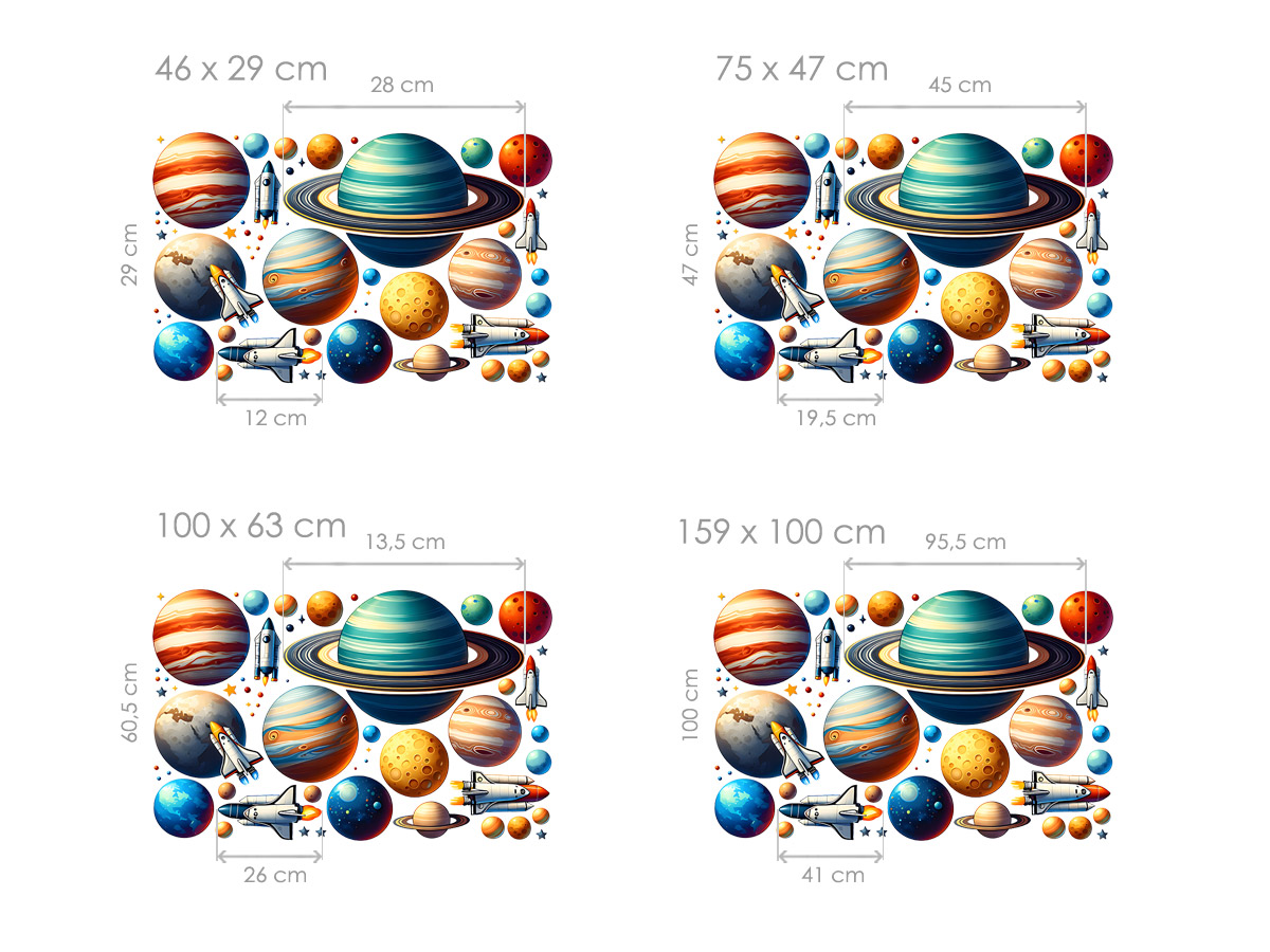 Samolepka na stenu „Vesmírné raketky“ prenesie detský izba do farebného sveta planét, rakiet a objavování nekonečného vesmíru. Dynamická kompozícia plná rôzne veľkých planét, kozmických lodí a drobných hviezd pôsobí hravo, ale zároveň harmonicky, takže sa ľahko prispôsobí ako menším, tak vetším priestorom. Jednotlivé motívy umožňují vytvoriť vlastní rozložení na stene – od výrazné centrální scény až po ľahko rozptýlený vesmírný motív po celé místnosti. Ilustrácie sú detailní, farebne vyvážené a pôsobí moderne aj nadčasovo, diíky čomu samolepka skvele doplí izba malých milovníkov rakiet, planét a vesmírných dobrodružstieví.