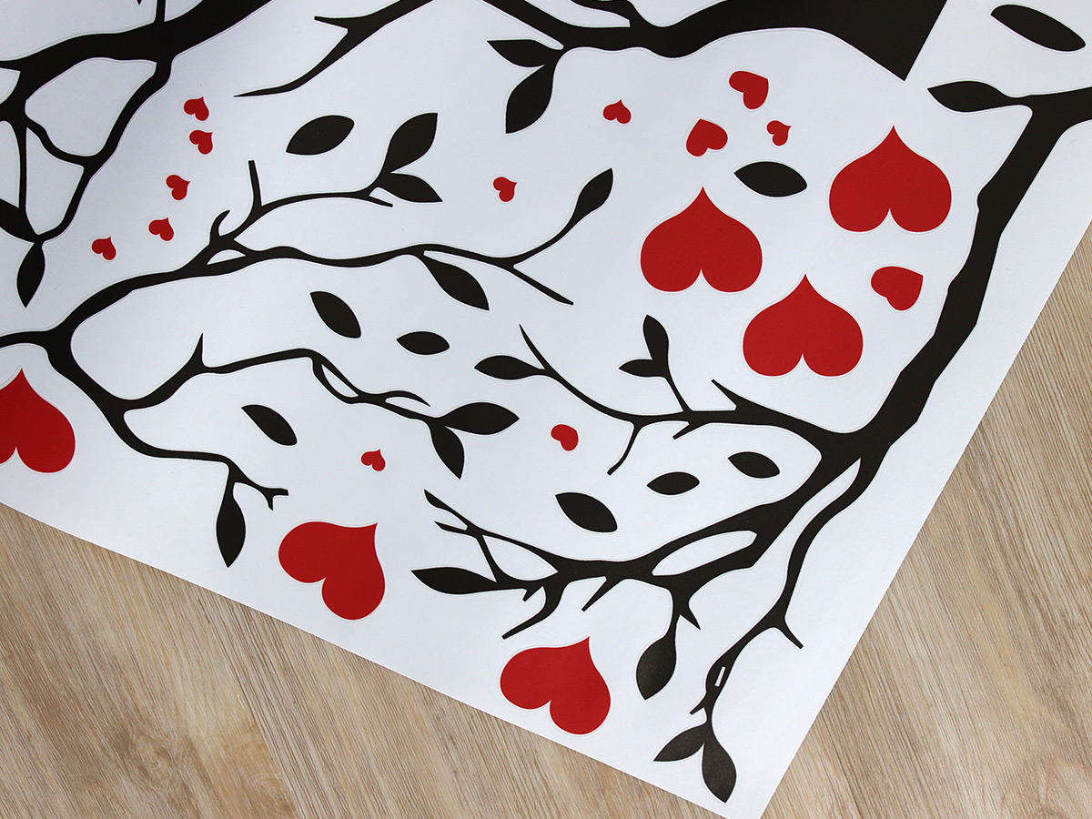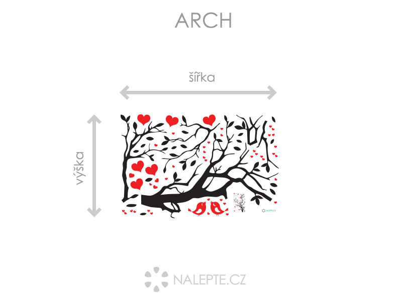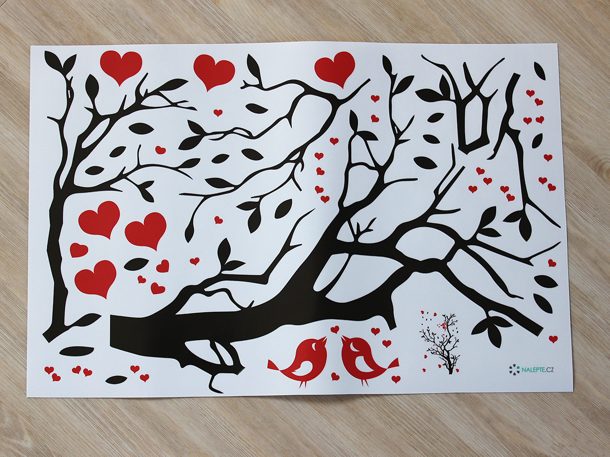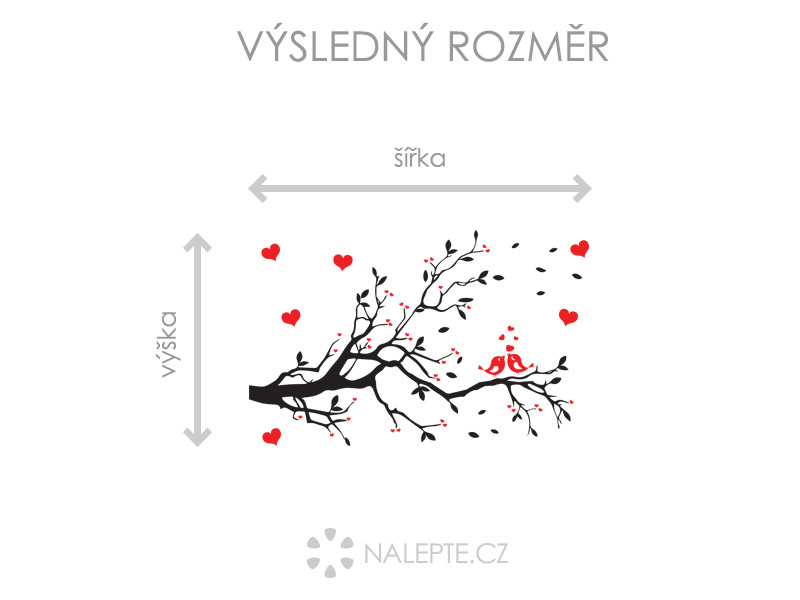 Výposledný rozmer = rozmer po nalepení na stenu. Tento rozmer volíte v objednáke. Arch = takto vám bude samolepka doručená. Z hárku jednotlivé části nalepíte na stenu, tak aby zložili výposledný motív. Prehľad rozmerov (šírka x výška): - výposledný rozmer 64 x 42 cm = hárok 46 x 30 cm - výposledný rozmer 105 x 67 cm = hárok 75 x 48 cm - výposledný rozmer 140 x 92 cm = hárok 100 x 66 cm - výposledný rozmer 271 x 179 cm = hárok 194 x 128 cm Túto samolepku vyrábíme iba v jednom farebném prevedí. Atraktívneí dizajn černé vetvy v kombinácii s červeními srdíčkami je vhodný predovším do obývacích izieb alebo spální. Výposledný dojem spečaťují dva červení roztomilí zamilovaní ptáčci. Odporúčame kombinovať s dalšími samolepkami z naší ponuky ídky. Napríklad dokúpiť další červená srdce či vtáky.
