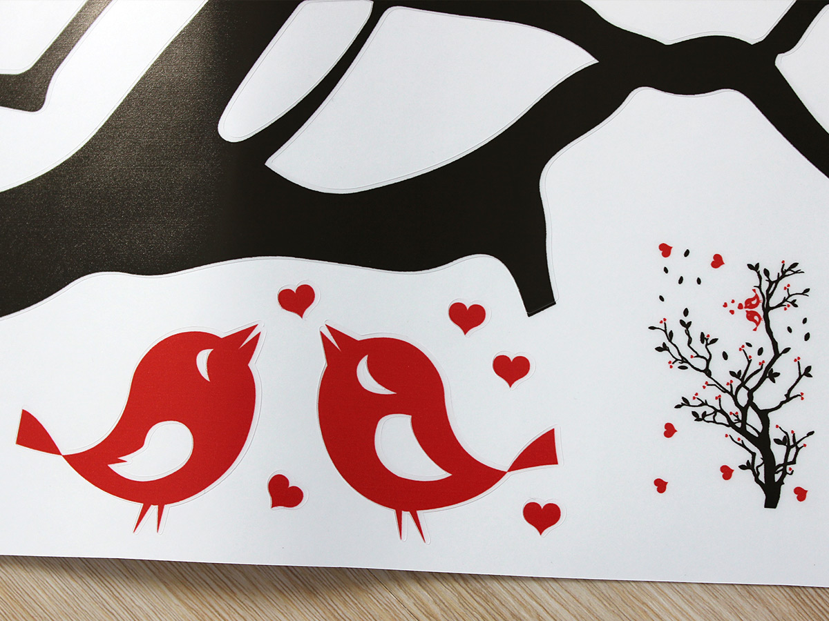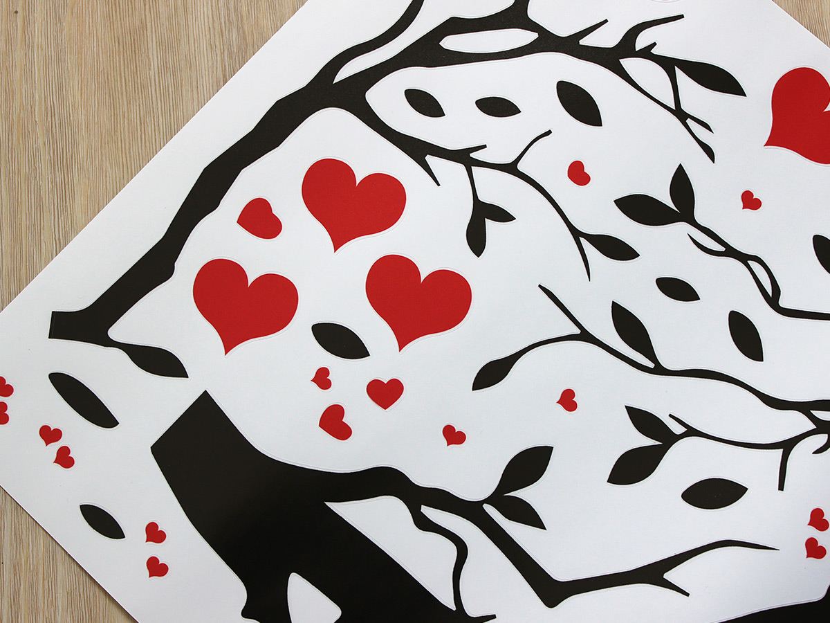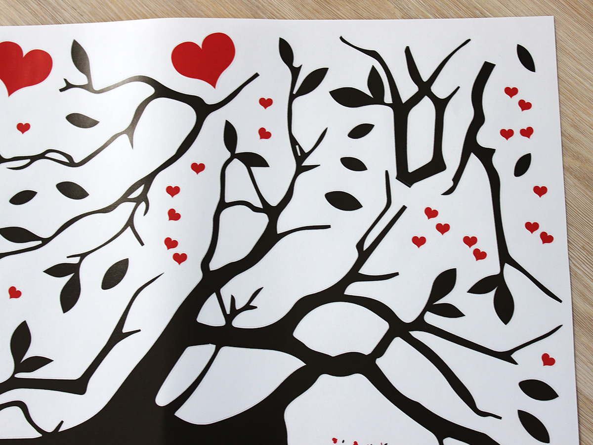 Výposledný rozmer = rozmer po nalepení na stenu. Tento rozmer volíte v objednáke. Arch = takto vám bude samolepka doručená. Z hárku jednotlivé části nalepíte na stenu, tak aby zložili výposledný motív. Prehľad rozmerov (šírka x výška): - výposledný rozmer 64 x 42 cm = hárok 46 x 30 cm - výposledný rozmer 105 x 67 cm = hárok 75 x 48 cm - výposledný rozmer 140 x 92 cm = hárok 100 x 66 cm - výposledný rozmer 271 x 179 cm = hárok 194 x 128 cm Túto samolepku vyrábíme iba v jednom farebném prevedí. Atraktívneí dizajn černé vetvy v kombinácii s červeními srdíčkami je vhodný predovším do obývacích izieb alebo spální. Výposledný dojem spečaťují dva červení roztomilí zamilovaní ptáčci. Odporúčame kombinovať s dalšími samolepkami z naší ponuky ídky. Napríklad dokúpiť další červená srdce či vtáky.