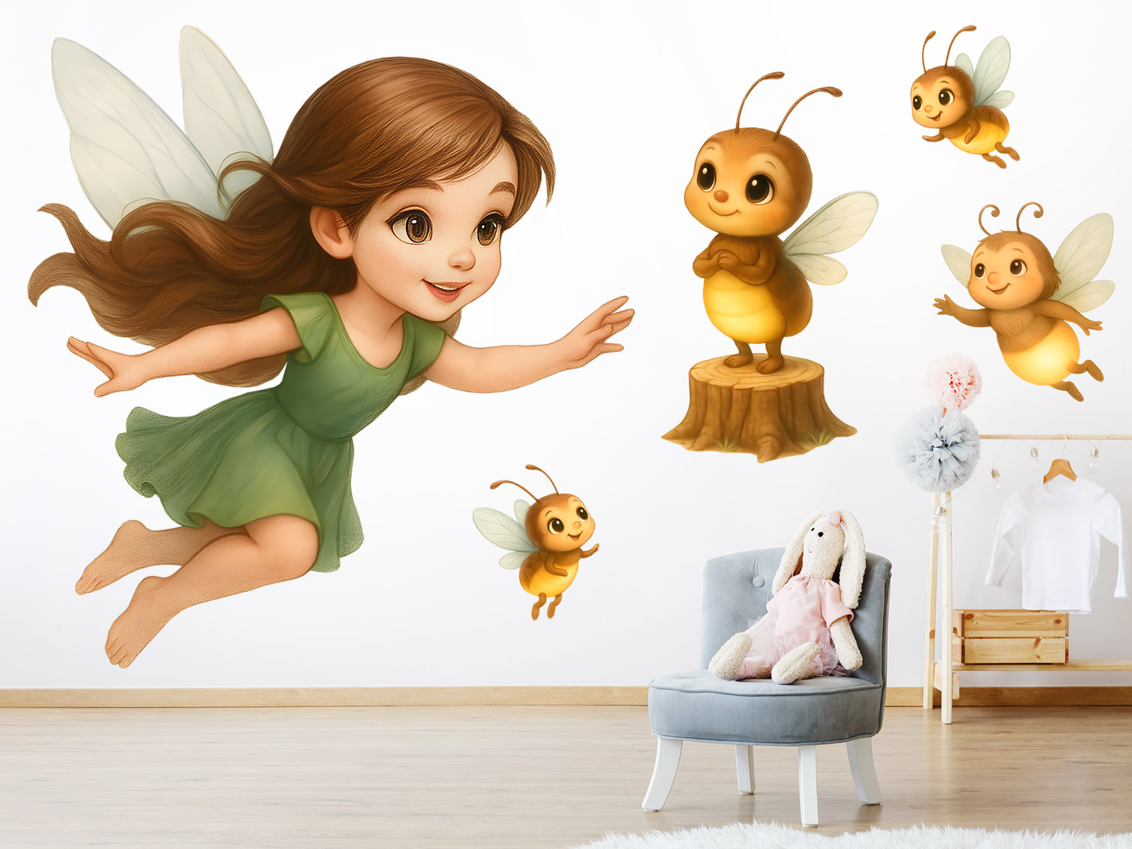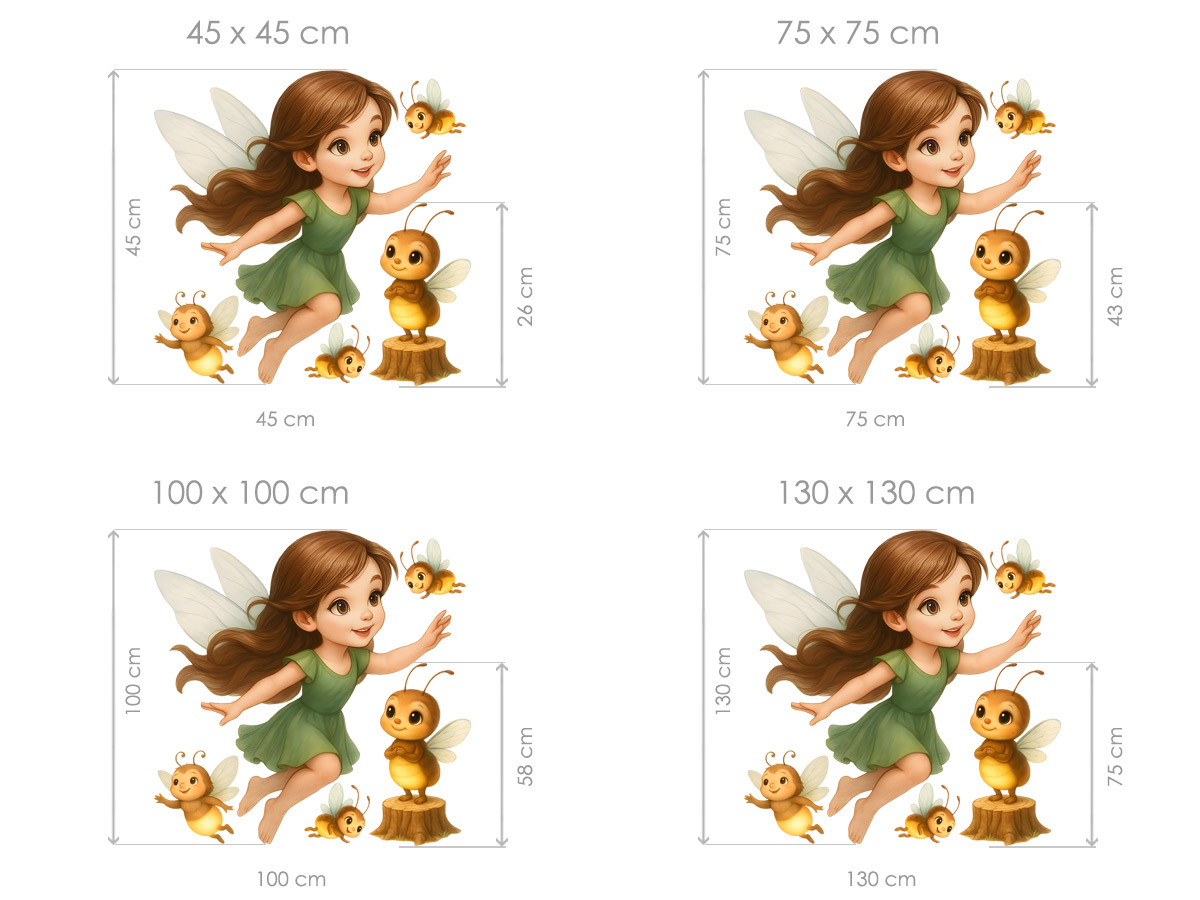 Samolepka na stenu „Víla a svetlušky“ premení každý detský izba v jemný, kúzelný svet plný fantázie a svetélkující radosti. Hlavním motívom je nežná víla s vlajícími vlásky a jemnými krídlami, ktorá pôsobí, ako by sa právo vzniesla zo stránky oblíbené pohádky. Doprevází ju roztomilé svetlušky – každá s vlastním výrazom a hravým pohybom – vrátane jedné stojící na pni, ktorá celému výjavu dodává príbehovú atmosféru. Díky archu s jednotlivými prvkami mô&ete vše kreatívne rozmísti† presne podπa volného priestoru a vlastního vkusu. Môžete také zvoliť ľubovoľnú veľkosť archu. Díky jemným farbám, mäkkému ilustrátorskému štýlu a čistélému pozadí sa motív dokonale hodí ako do dívích izbíčkov, tak aj do školiek, kam prinesie pocit ľahkosti, radosti a pohádkového dobrodružstva.