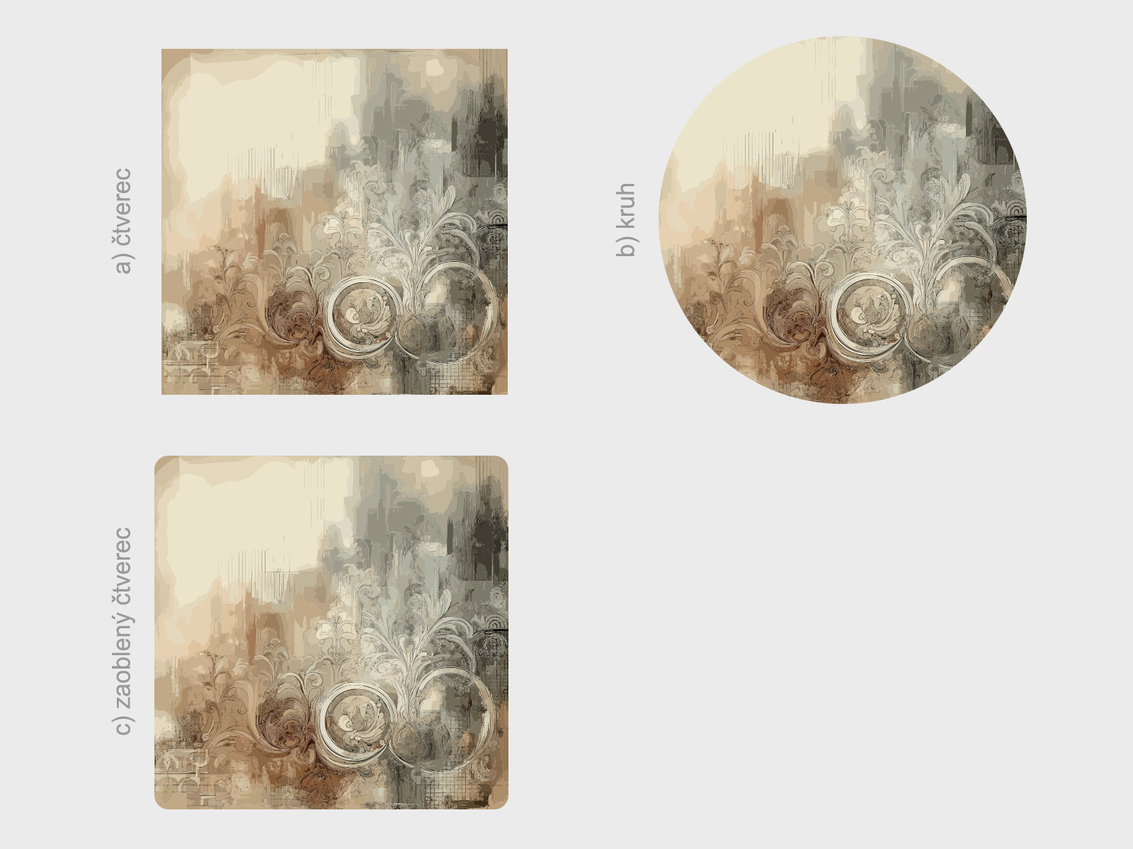 Tvar je možné zmeniť. Možno vybrať a) štvorec, b) kruh, c) zaoblený štvorec viď fotogaléria. Ak teda máte zájem o iný tvar ako na hlavní fotografiu, stačí v posledním kroku objednávky do pola poznámka napísa napr. "kruh". Jedná sa o tištený samolepící plakát - imitácia maľby Je možné zvoliť aj ľubovoľneý vlastní rozmer hárku pomocí posuvníku alebo klikání na "Vetší", "Menší"