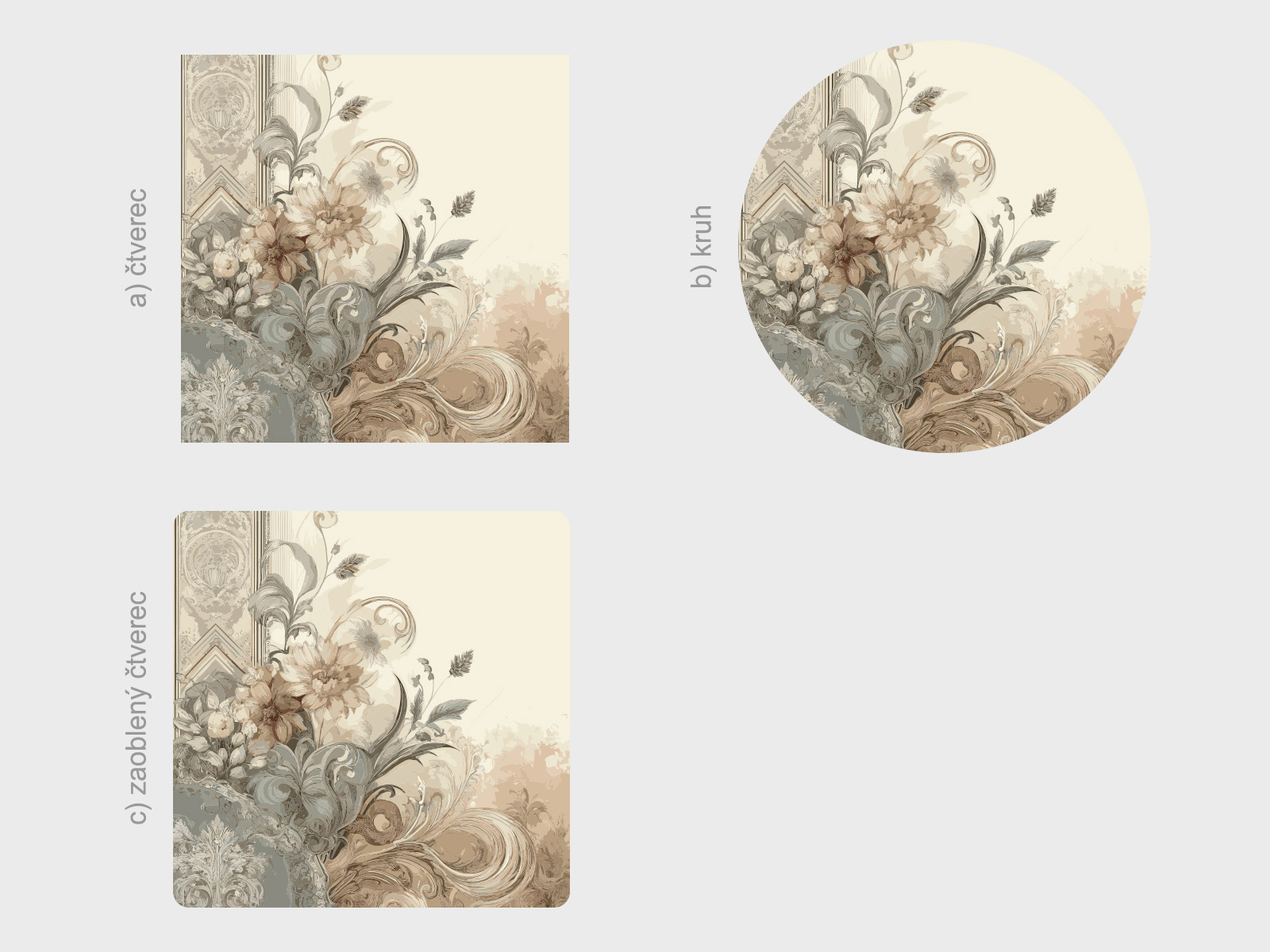 Tvar je možné zmeniť. Možno vybrať a) štvorec, b) kruh, c) zaoblený štvorec viď fotogaléria. Ak teda máte zájem o iný tvar ako na hlavní fotografiu, stačí v posledním kroku objednávky do pola poznámka napísa napr. "kruh". Jedná sa o tištený samolepící plakát - imitácia maľby Je možné zvoliť aj ľubovoľneý vlastní rozmer hárku pomocí posuvníku alebo klikání na "Vetší", "Menší"