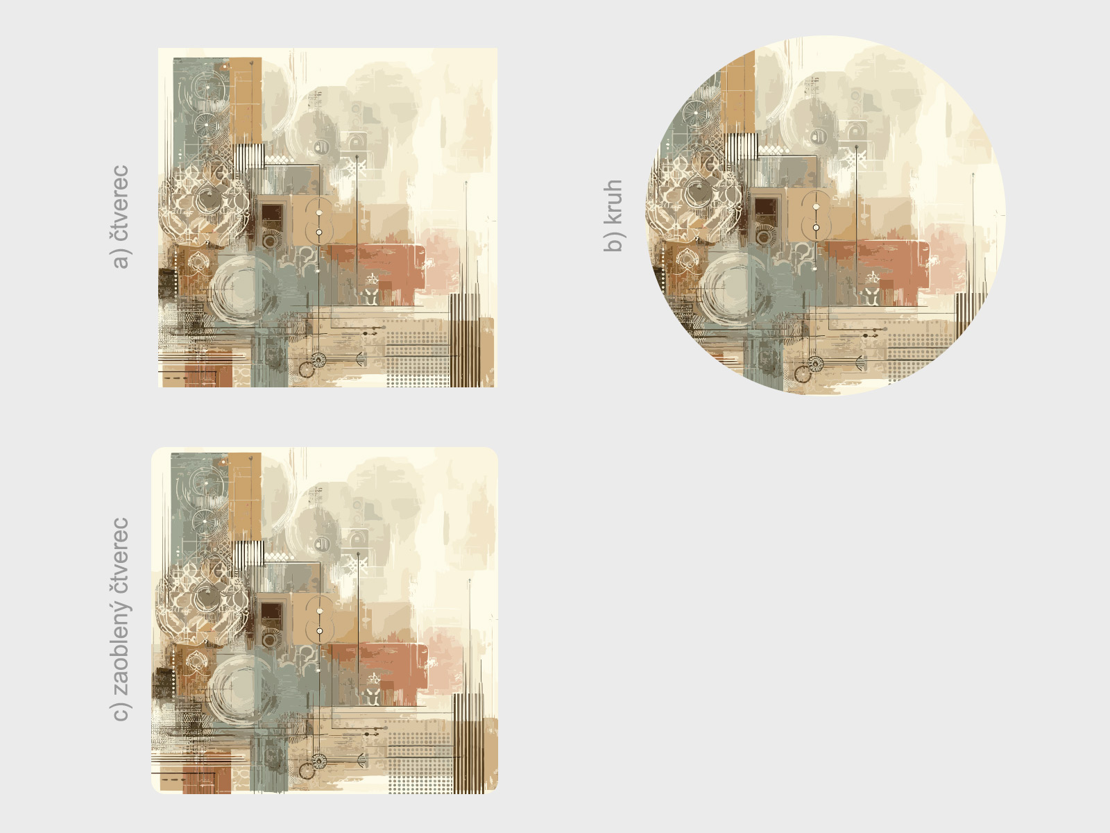 Tvar je možné zmeniť. Možno vybrať a) štvorec, b) kruh, c) zaoblený štvorec viď fotogaléria. Ak teda máte zájem o iný tvar ako na hlavní fotografiu, stačí v posledním kroku objednávky do pola poznámka napísa napr. "kruh". Jedná sa o tištený samolepící plakát - imitácia maľby Je možné zvoliť aj ľubovoľneý vlastní rozmer hárku pomocí posuvníku alebo klikání na "Vetší", "Menší"