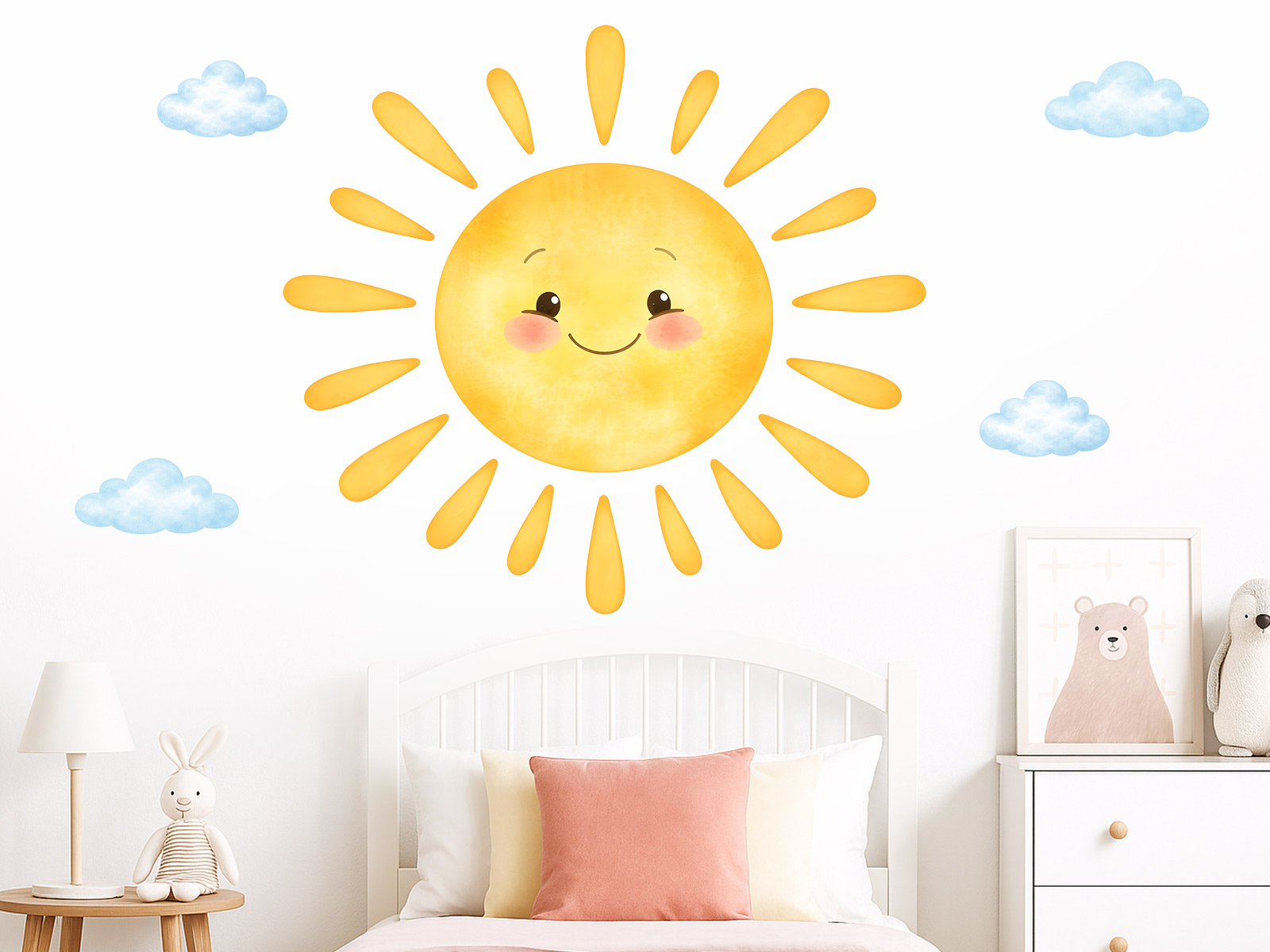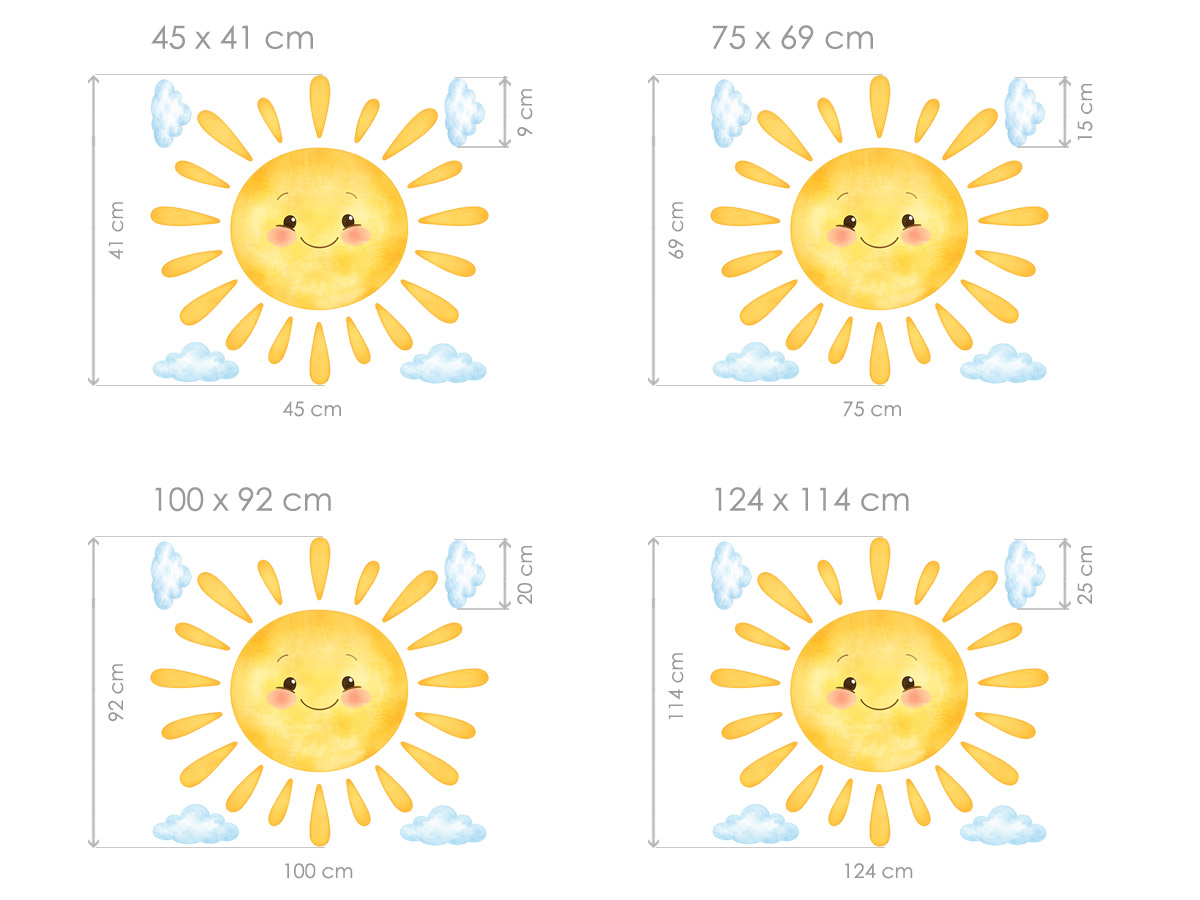 Samolepka na stenu „Vysmaté slníčko“ vnesie do detskej izby radosť, pohodu a hrejivú atmosféru plnú pozitívneí energie. Roztomilé slníčko s usmievavým výrazom, jemními tváričkami a mäkk&´mi lƆarmi pôsobí milo, priátelsky a okamžite rozjasní celý priestor. Akvarelový štýl v kombinácii s jemními obláčkami vytvára&´ ľahký, vzdušný dojem, ktorý sa krásne hodí do izbíčky bábätiek aj vetších detí. Díky samostatným prvkom je mo\u0165mo motív rozmísti########### fantázie a prispôsobiť ho veľkosti aj uspor&iaacute;dání místnosti. Samolepka je ideální voľbou pre vytvorenieí kľudného, veselého a útulného prostredí, kde sa deti budú cítiť bezpečne, spokojne a každý deň je privítá usmievavé slnko.