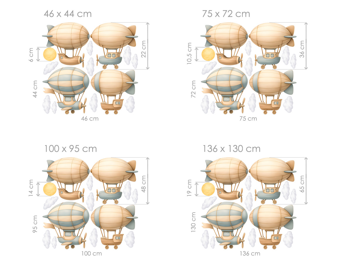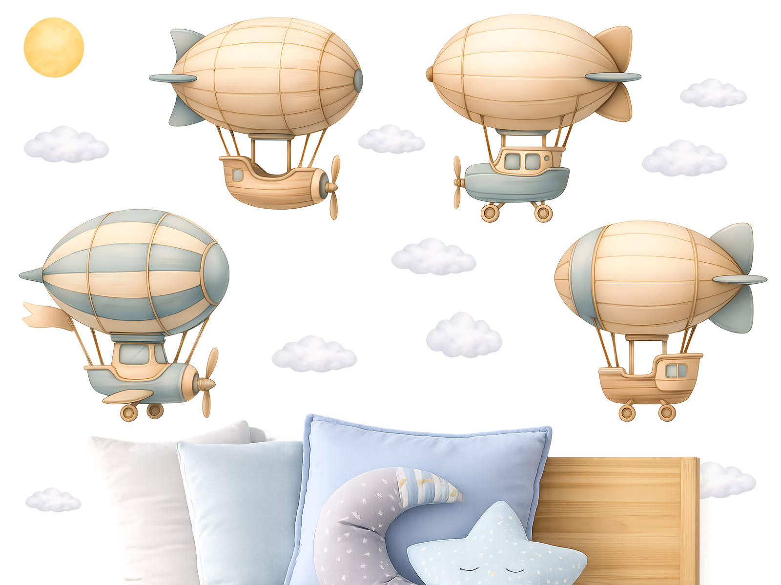 Nálepky na stenu „Vzducholode pre deti“ vnášajú do detskej izby pokojnú a rozprávkovú atmosféru plnú dobrodružstiev v oblakoch. Jemne ilustrované vzducholode v pastelových odtieňoch béžovej a modrej pôsobia elegantne a zároveň hravým dojmom. Motív dopĺňajú obláčiky a slnko, ktoré vytvárajú pocit pokojnej oblohy a ľahkosti. Vzducholode pôsobia, ako keby sa pomaly vznášali nad izbou, čo podporuje detskú fantáziu a vytvára príjemné prostredie na oddych aj hranie. Dekorácia sa skvele hodí do detskej izby, najmä pre bábätká alebo malé deti. Vďaka jemným farbám sa ľahko kombinuje s ostatným vybavením a pomôže vytvoriť útulný, harmonický priestor inšpirovaný svetom nad oblakmi.